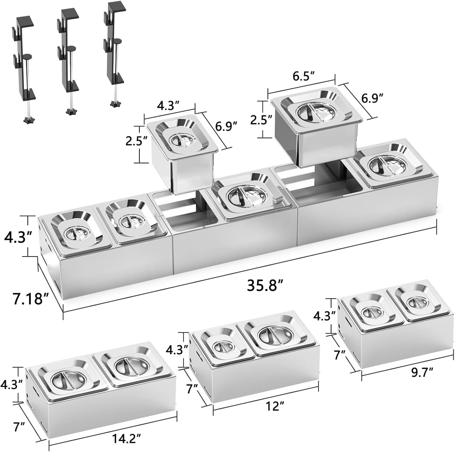 • Condiment Caddy Design-With three 2L and three 1.3L containers, it is a perfect tools for preparing ingredients and toppings. Each container is fitted with a lid,could be easily stacked and stored in the fridge. Specially designed to fit on our tables, and it keep the ingredients fresh and clean, free from environmental contamination ►What you get-3*seasoning box holder modules, 3*large containers, 3*small containers