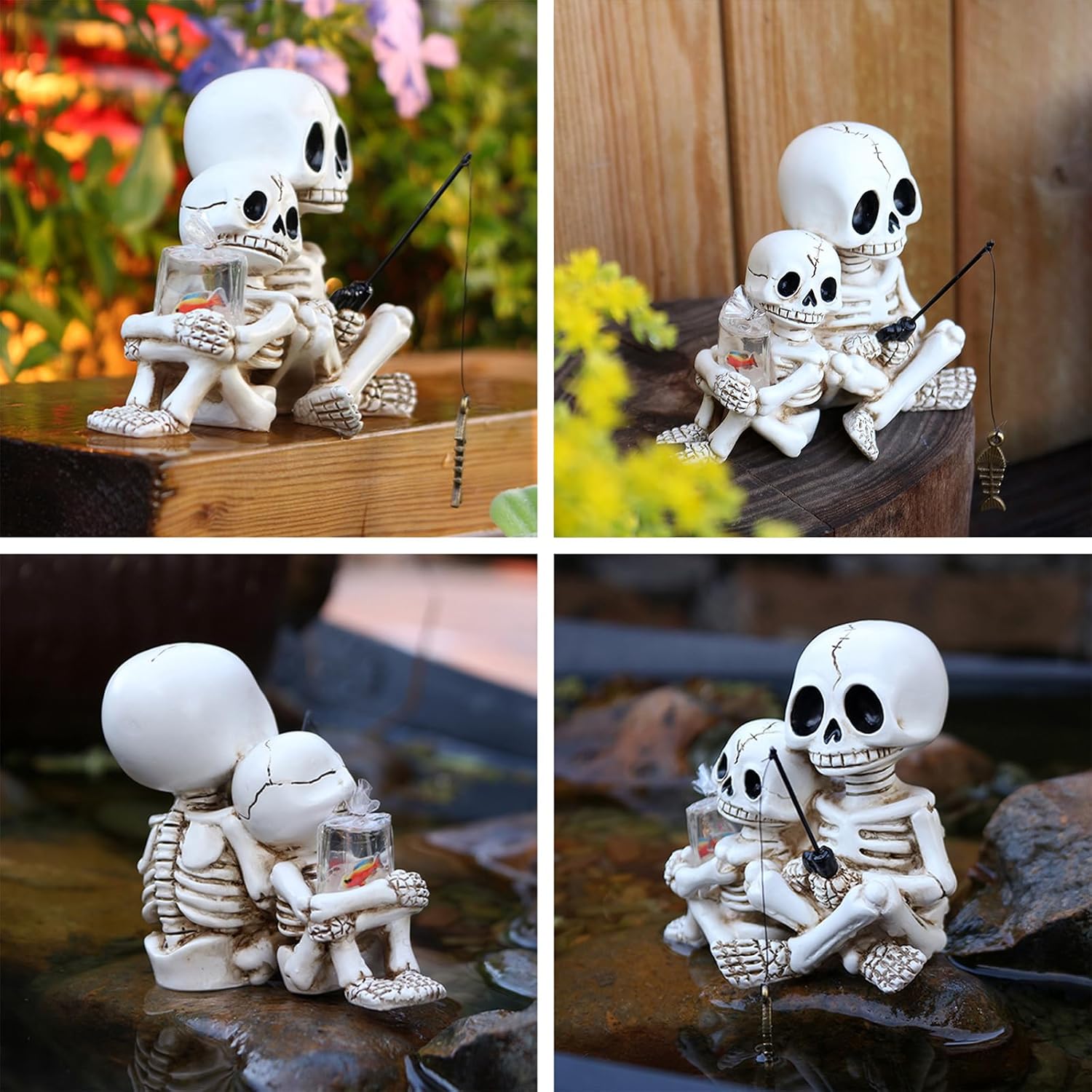 Fishing Skeleton Statue Halloween Decorations, Mini Cute Sitting Skull Figurine Shelf Sitter Resin Sculpture for Outdoor Garden Yard Lawn Pond Waterfalls Pool Ornaments