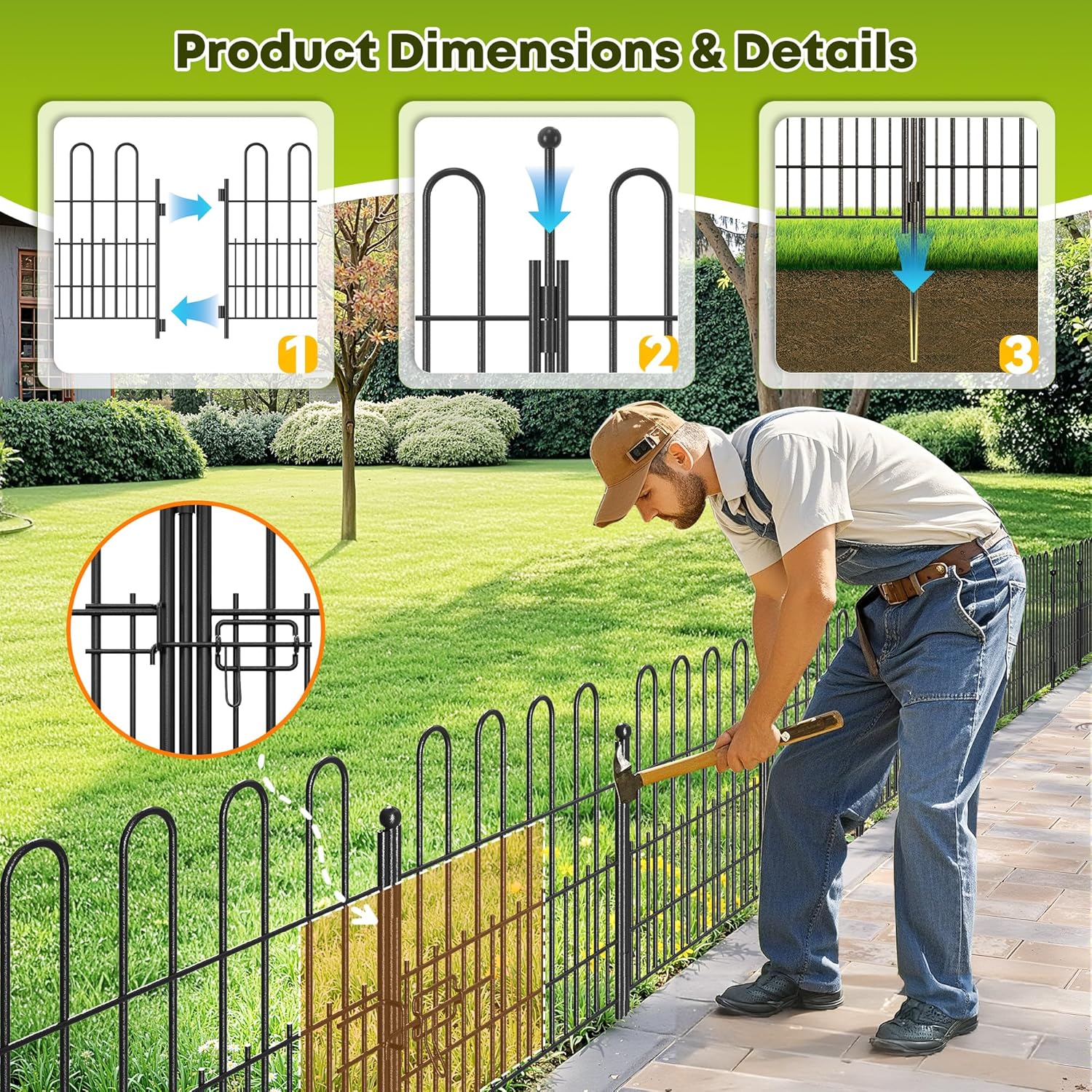 • 【Sturdy Decorative Fence】 The metal ground stakes can be inserted up to 14.72 inches into the ground. The metal fencing panels with a black protective coating is built to withstand outdoor weather and can be used for a long time. The classic U-shaped fencing offers both functional protection and an elegant decorative touch to enhance the aesthetics of the courtyard