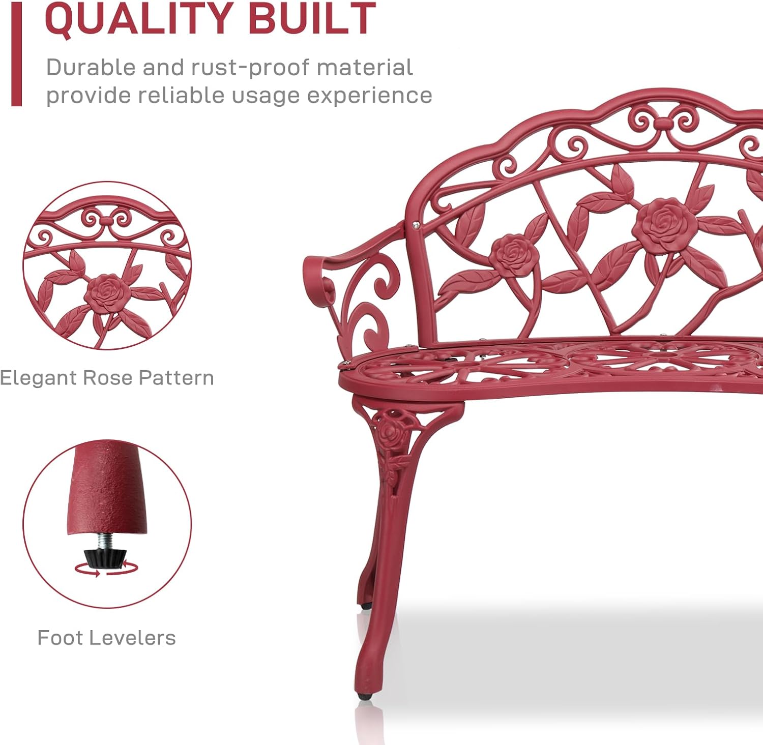 Bonnlo 38.5" Patio Outdoor Bench, Cast Anti-Rust Iron Aluminum Garden Bench with Rose Patten Finish Chair, Entryway Bench 2 Person Seat for Patio, Lawn, Backyard