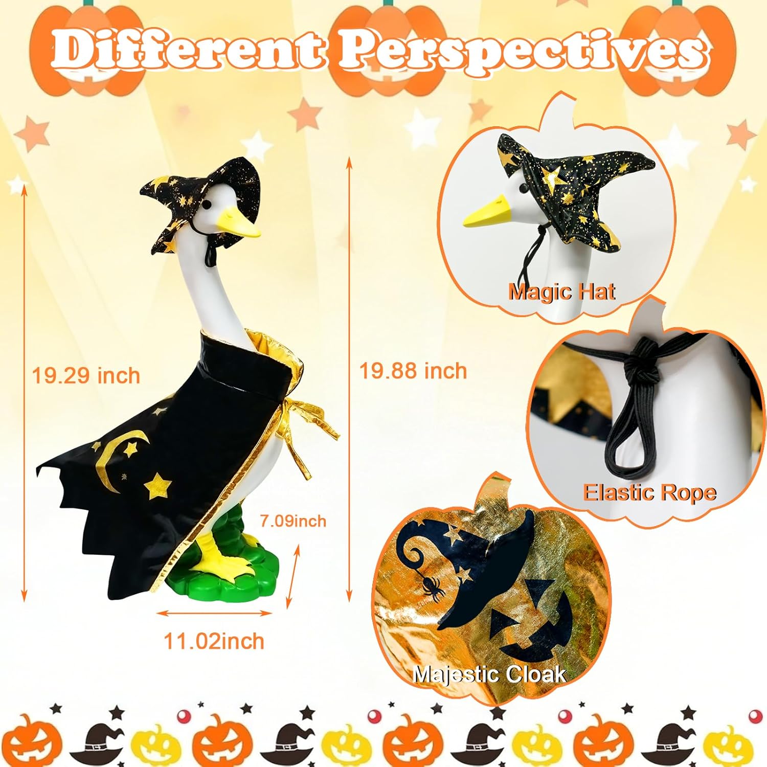 Large White Goose Statue Cygnus, Funny Halloween Big Bird Decor Garden Sculpture with Black Magic Cloak Costume Clothes and Hat Home Porch Patio Pond Yard Art Duck Figurine 19’’ Christmas Decorations