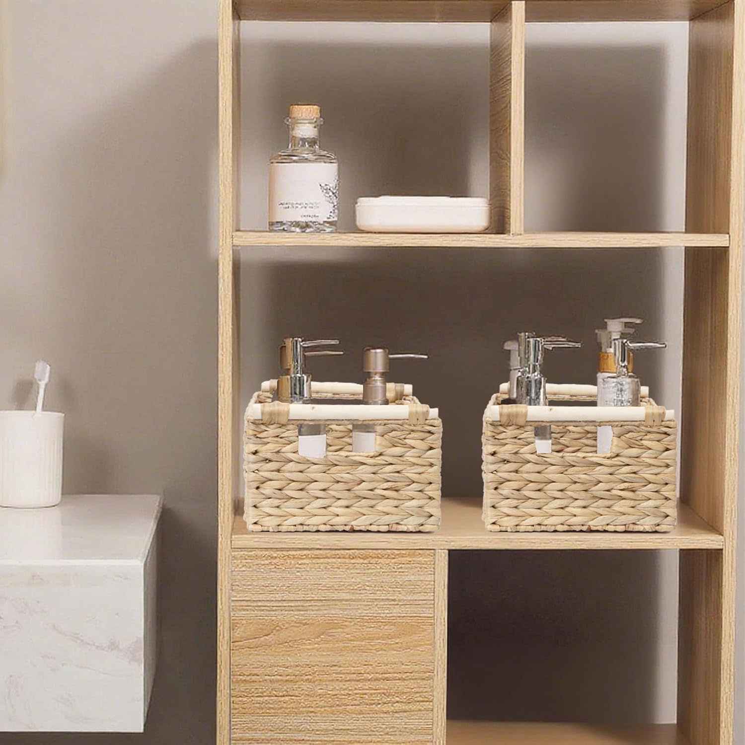 Handmade Water Hyacinth Woven Storage Baskets with Wooden Handles, Rectangle Rustic Organizer Set for Home Decor, Kitchen, Bedroom & Office (Small)