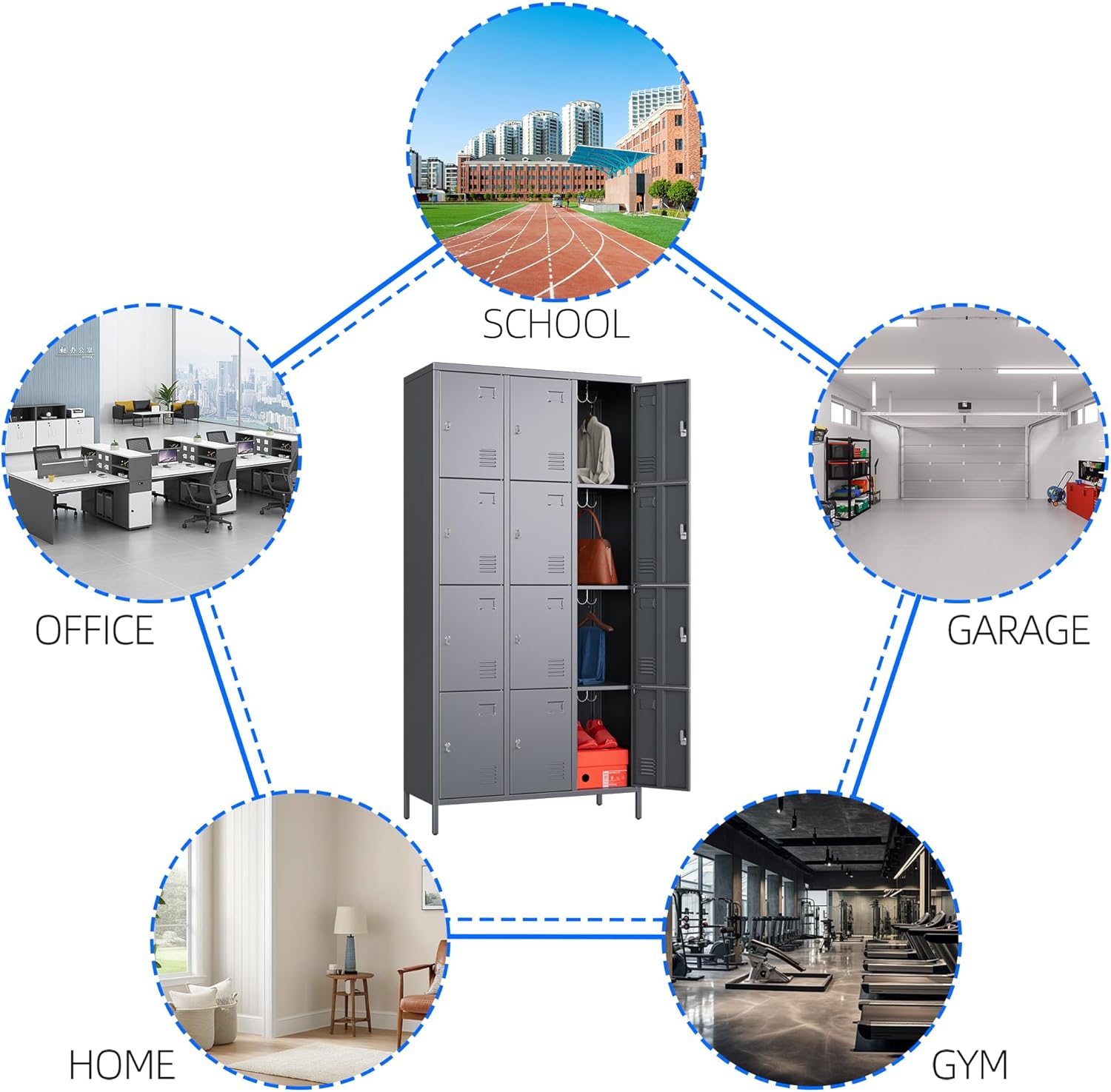 • 【Large Storage Capacity】12 doors metal lockers for employees with Lock 15.75"D x 35.43"W x 72"H. Equipped with 1 2 hooks,it can meet your needs for storing different sized items and meet most of your daily needs.