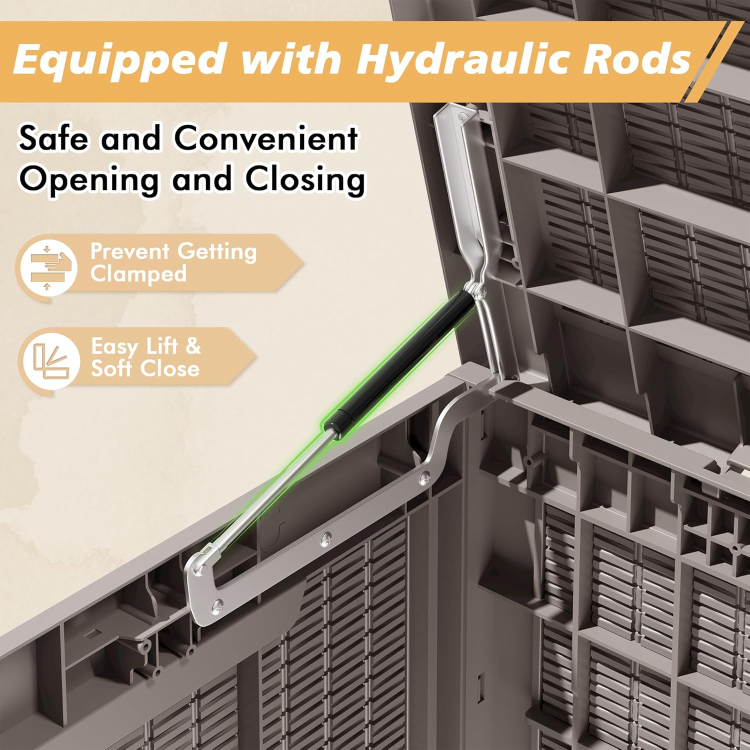 • 👍 Hydraulic Lid with Lockable Design for Safe Access Equipped with hydraulic gas lift rods, the lid opens smoothly and closes gently to prevent pinched fingers. The lockable lid adds an extra layer of security, making it an ideal choice for shared outdoor spaces or secure backyard storage. (Lock not included)