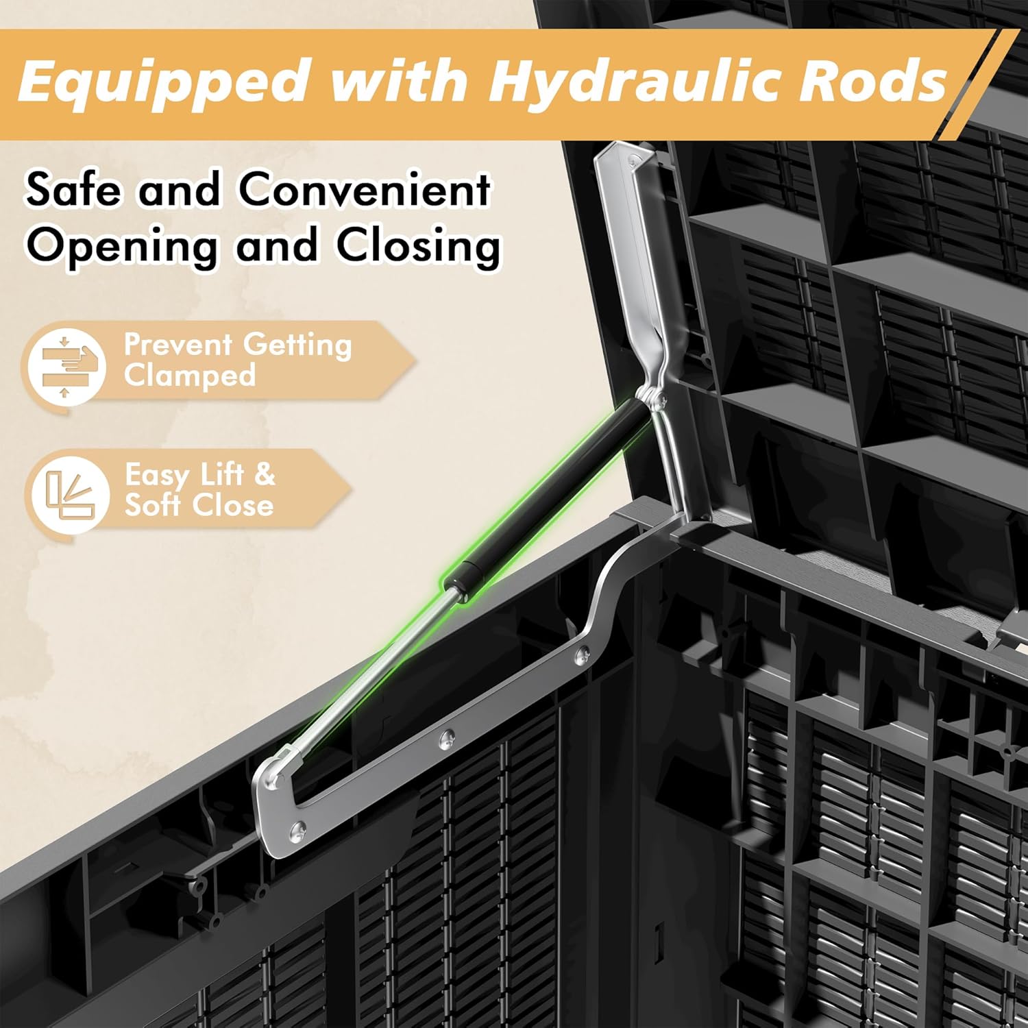 • 👍 Hydraulic Lid with Lockable Design for Safe Access Equipped with hydraulic gas lift rods, the lid opens smoothly and closes gently to prevent pinched fingers. The lockable lid adds an extra layer of security, making it an ideal choice for shared outdoor spaces or secure backyard storage. (Lock not included)