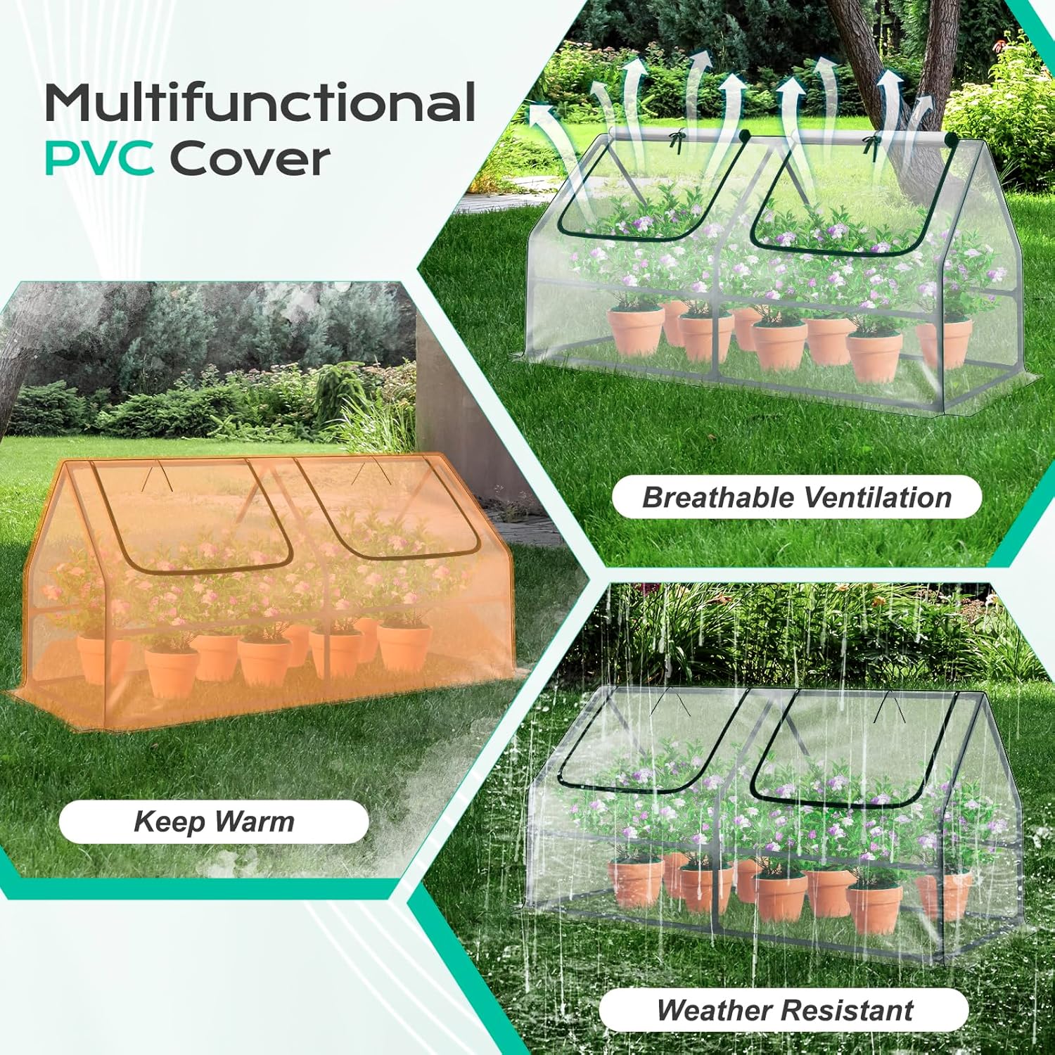 • Durable All-Season PE Cover: Part of our premium greenhouse kits, the durable PE cover / PVC cover shields plants from harmful UV rays and inclement weather, while preserving heat and moisture during colder months