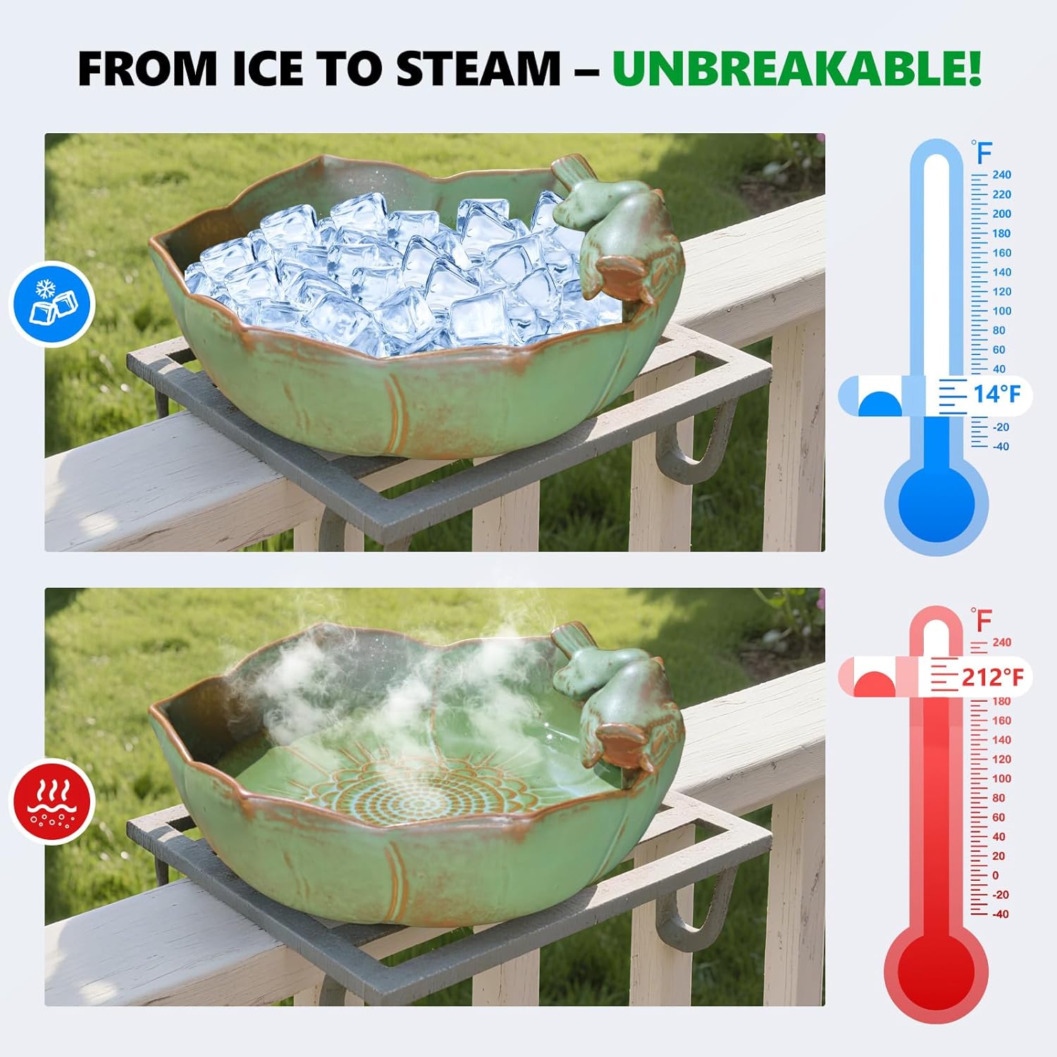 • Premium Ceramic Bird Bath – Built to Last: Unlike cheap resin, our thick, high-fired ceramic bird bath bowl resists peeling, cracking, and fading—even in extreme heat or frost. The non-toxic glaze ensures safe drinking water for birds, squirrels, and pollinators.