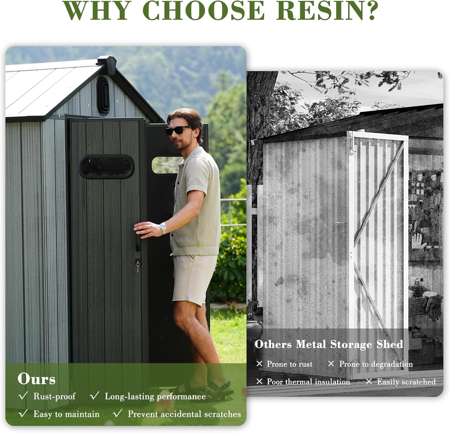 • Durable Resin Shed: Unlike conventional metal storage shed, resin sheds deliver superior environmental benefits while being rust-proof and corrosion-resistant for long-term durability. The construction eliminates sharp edges, preventing accidental scratches during use.