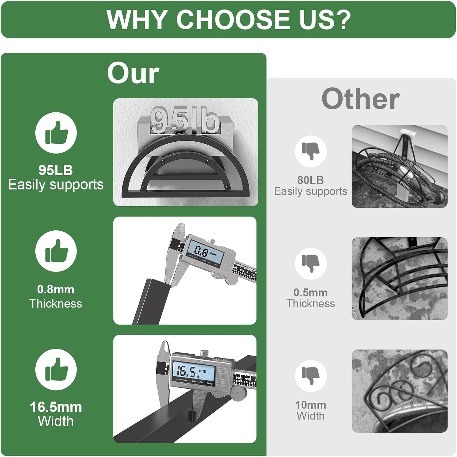 • [HEAVY DUTY HOSE HOLDER]: This garden hose holder wall mounted can hold up to 125 feet of hose. Gives strong reliability with up to 95 lbs of bearing weight. Our garden hose holder was made of high-strength and heavy-duty metal, 0.8mm thickness and 16.5mm width, other hose holder is 0.5mm thick and 10mm wide. So our hose rack is stronger that keep from bending and provide great load-bearing capacity