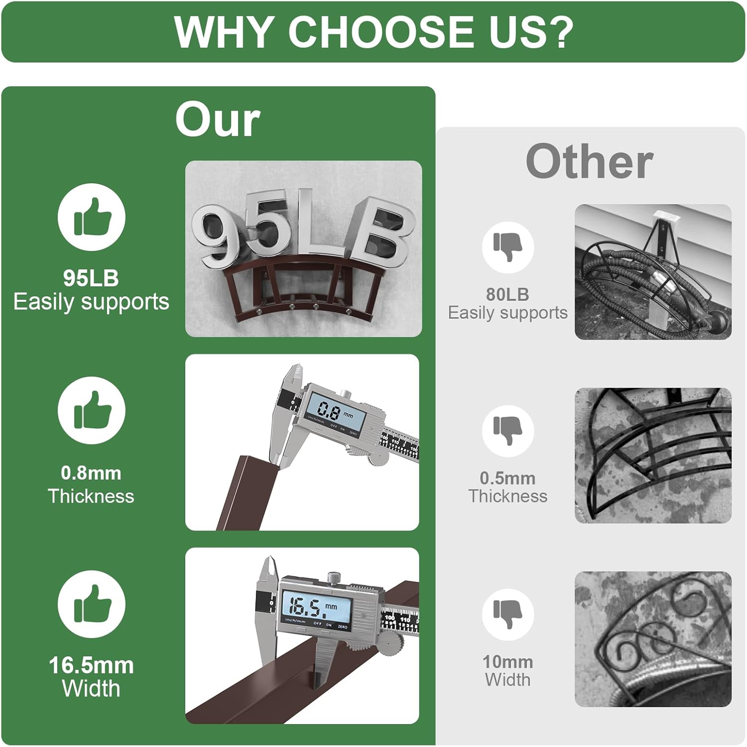 • [HEAVY DUTY HOSE HOLDER]:This garden hose holder wall mounted can hold up to 125 feet of hose. Gives strong reliability with up to 95 lbs of bearing weight. Our garden hose holder was made of high-strength and heavy-duty metal, 0.8mm thickness and 16.5mm width, other hose holder is 0.5mm thick and 10mm wide. So our hose rack is stronger that keep from bending and provide great load-bearing capacity