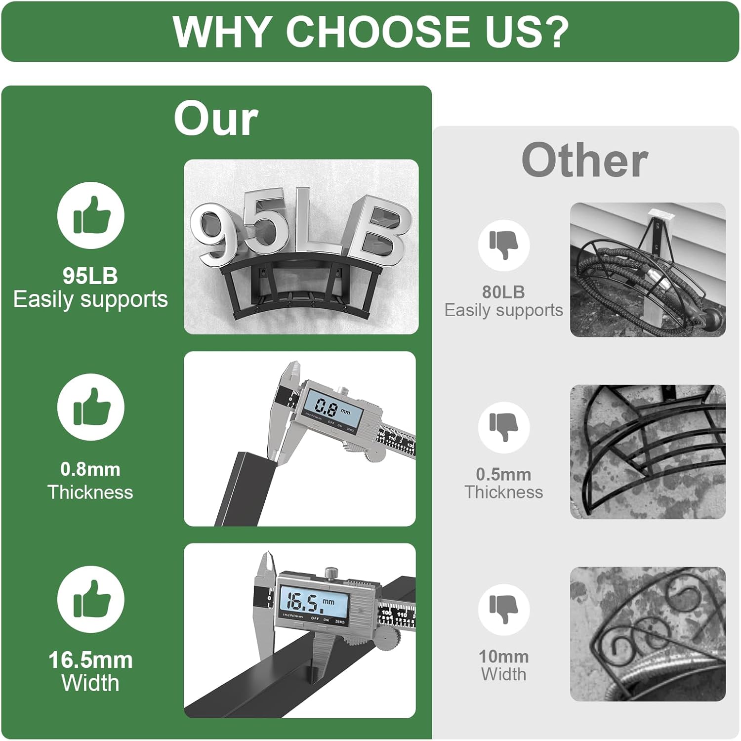 • [HEAVY DUTY HOSE HOLDER]:This garden hose holder wall mounted can hold up to 125 feet of hose. Gives strong reliability with up to 95 lbs of bearing weight. Our garden hose holder was made of high-strength and heavy-duty metal, 0.8mm thickness and 16.5mm width, other hose holder is 0.5mm thick and 10mm wide. So our hose rack is stronger that keep from bending and provide great load-bearing capacity