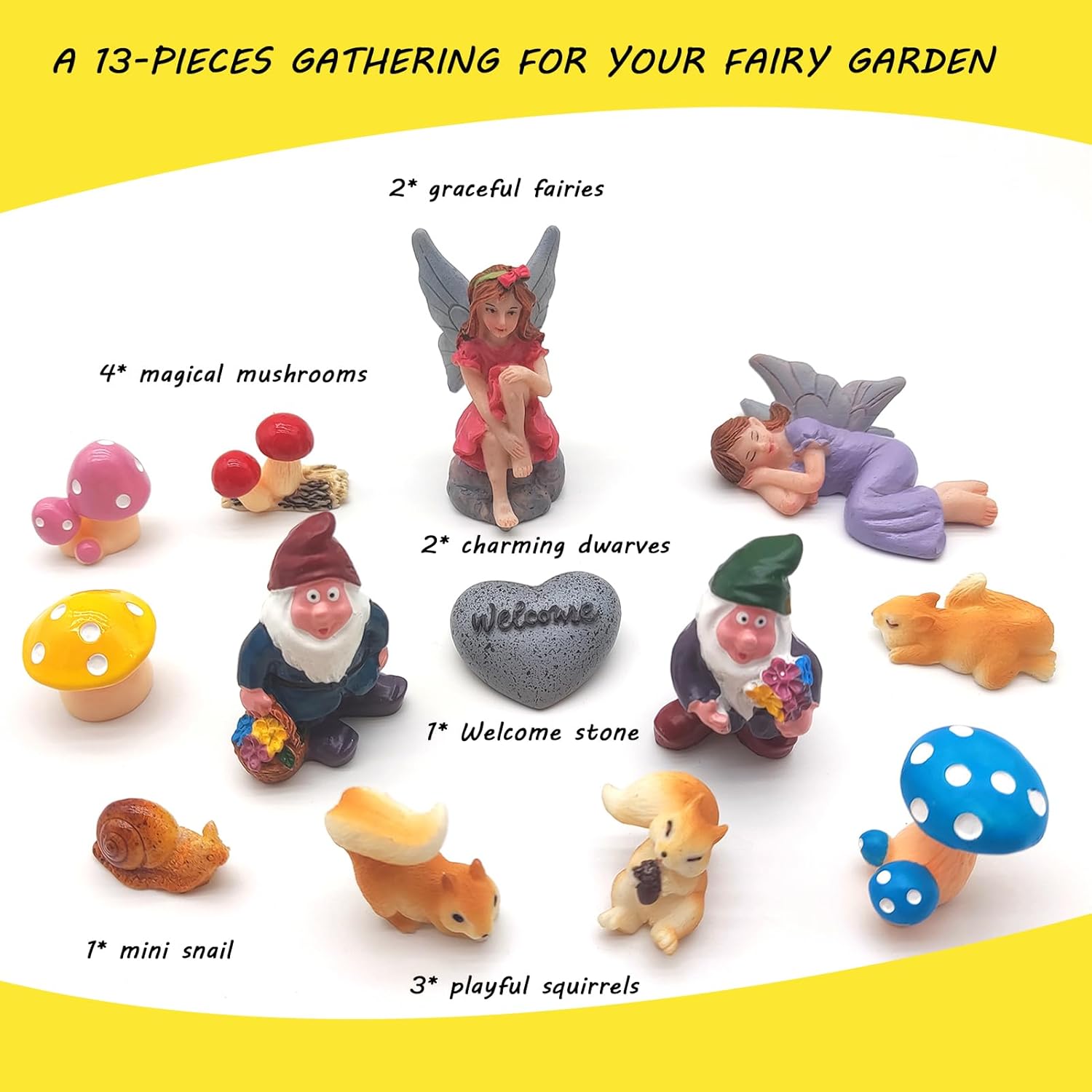• 【Fairy Garden Kit】- Our 13pcs fairy garden set is carefully designed to tell a harmonious story. With 2 graceful fairies in unique poses and colors, 2 charming dwarves, 3 playful squirrels, 4 magical mushrooms, a mini snail and a Welcome stone, you can create a vibrant and lifelike enchanted scene that sparks imagination and wonder