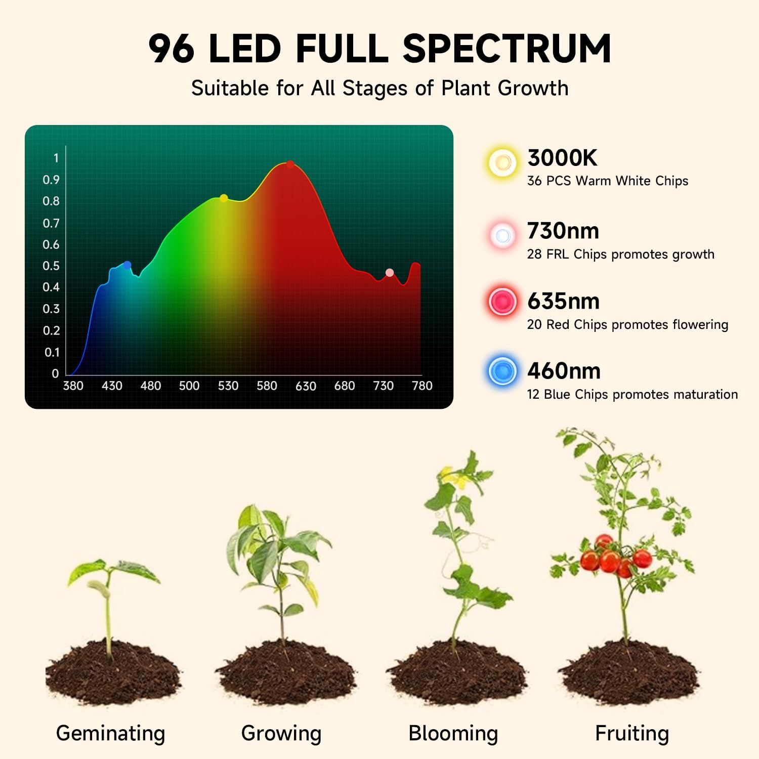 • 【Full Spectrum Light】The hemispheric lamp design enables a wider illumination range. It contains 96 LEDs and provides full-spectrum light. Among them, there are 12 blue LEDs (460nm), 20 red LEDs (635nm), 28 far-red light LEDs (730nm), and 36 warm white LEDs (3000K). Improve the growth rate and meet the light energy demand of plants in the whole process of germination, growth, flowering and fruiting.