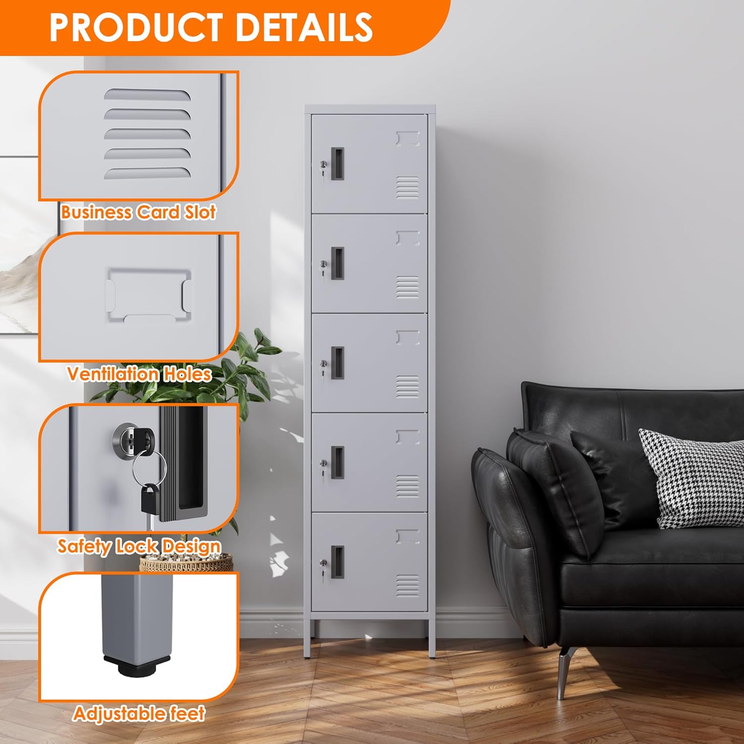 5 Doors Metal Storage Locker for Employees,Steel Home Office Storage Cabinet,66" H Employee Lockers with Adjustable Feet for School Gym Home Office, Assembly Required,Dark Grey