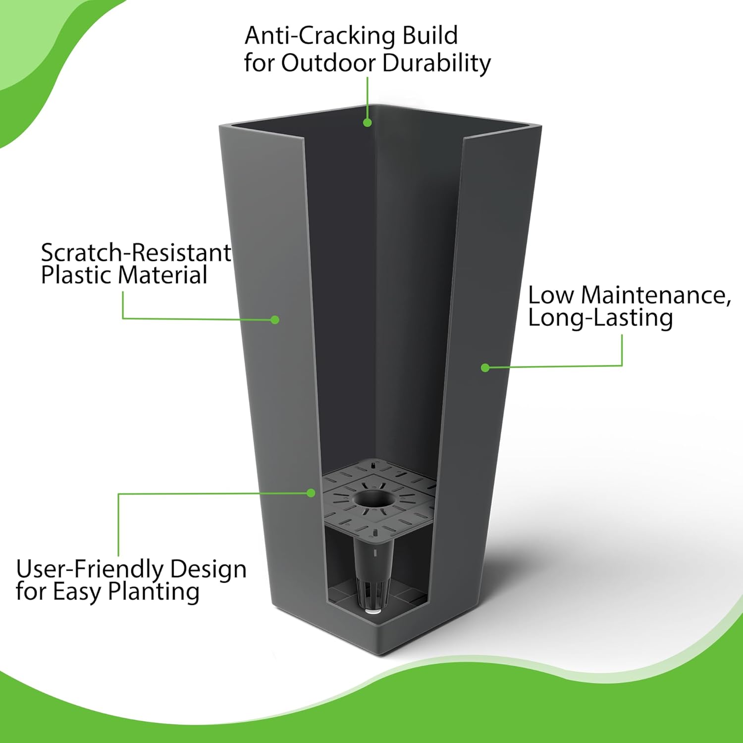 • Built to Endure All Weather Conditions: Crafted from premium, weather-resistant plastic, these tall planters for outdoor plants are designed to resist cracking, fading, and damage from the sun, rain, and snow. Perfect for any season, these large planters for outdoor plants ensure long-lasting durability, making them an excellent choice for outdoor and indoor gardening alike.