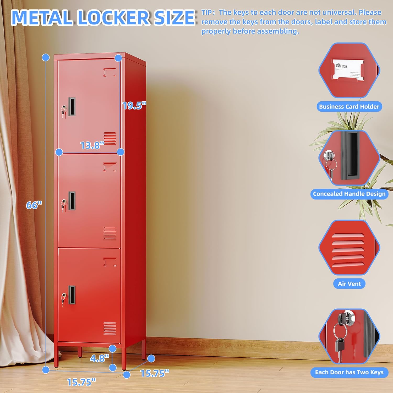 66" H*15.75" D*15.75" W Steel Storage Cabinet,3 Doors Metal Storage Locker for Employees,Employee Lockers with Lock,Hooks and Card Slot for School Gym Home Office, Assembly Required,Red,240 LBS