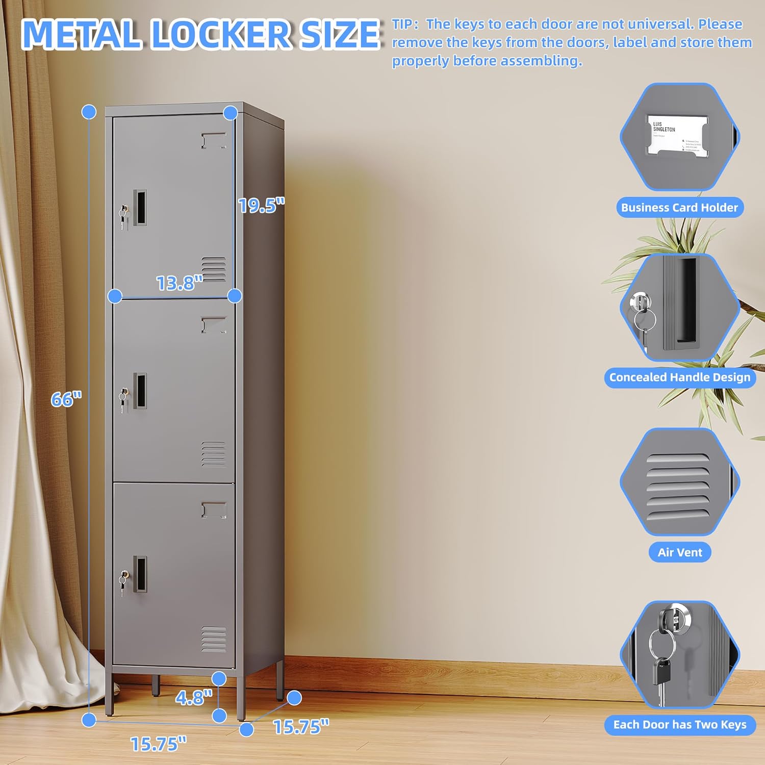 66" H*15.75" D*15.75" W Steel Storage Cabinet,3 Doors Metal Storage Locker for Employees,Employee Lockers with Lock,Hooks and Card Slot for School Gym Home Office, Assembly Required,Dark Grey,240 LBS