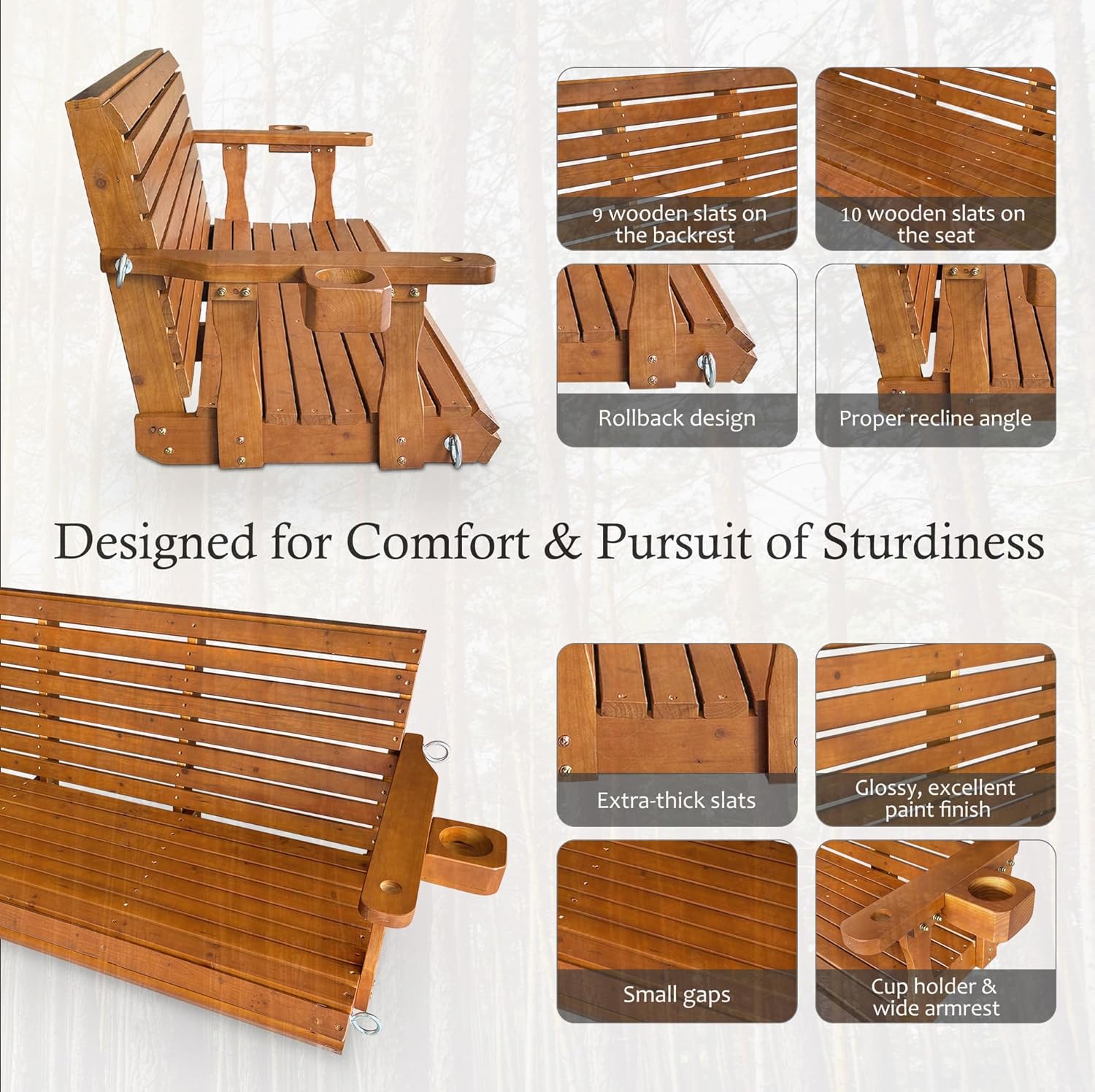 Wooden Porch Swing 2-Seater, Bench Swing with Cupholders, Hanging Chains and 7mm Springs, Heavy Duty 800 LBS, for Outdoor Patio Garden (Warm Teak Color, 5 FT Extra Large)
