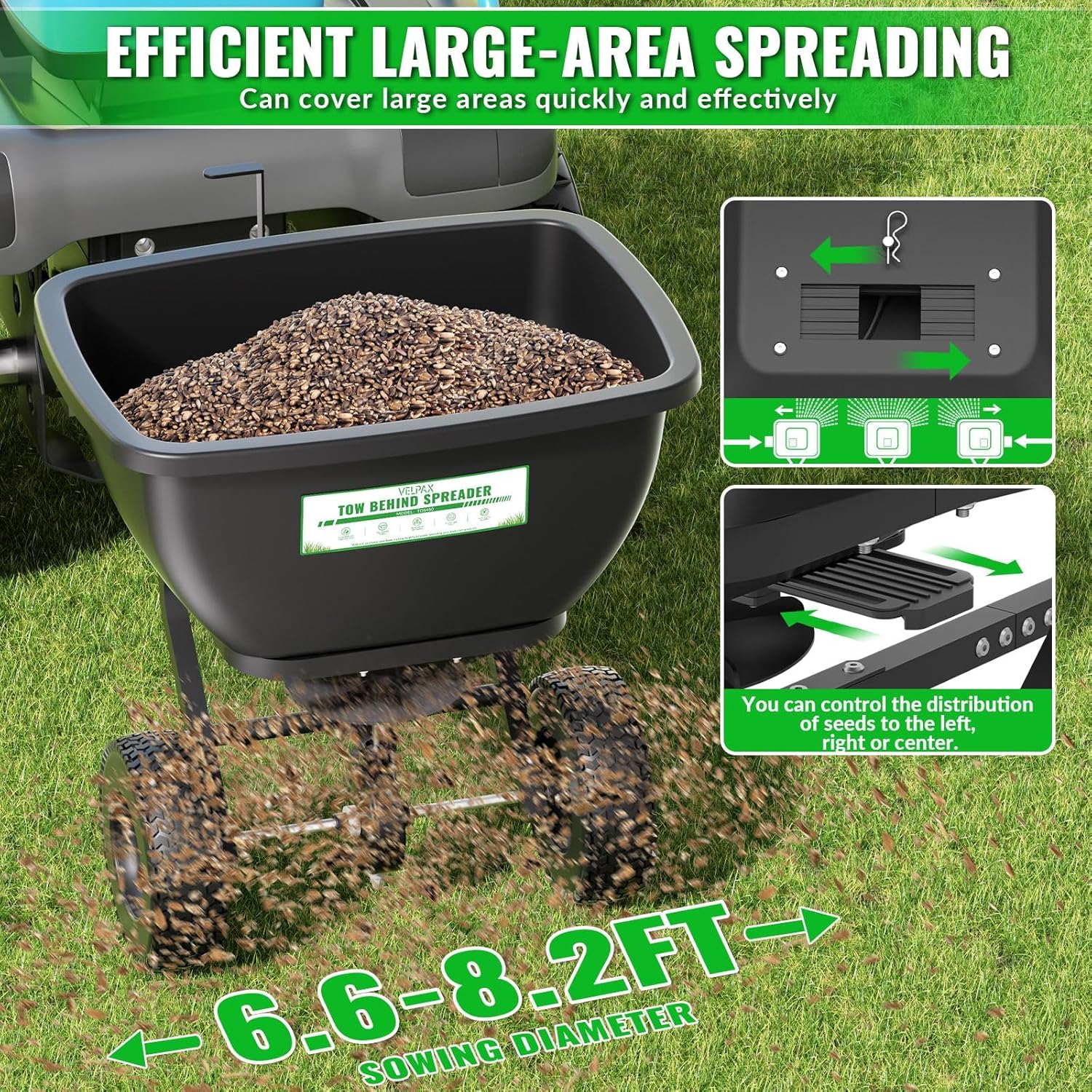 • 【High-capacity Hopper】-Say goodbye to constant refills! Our tow-behind spreader features a rugged 200 lb. poly hopper—rust-proof, dent-resistant, and built to handle large jobs with ease. Perfect for seed, fertilizer, ice melt, and more, it covers up to 50,000 sq. ft. per load, saving you time and effort on expansive lawns or fields.