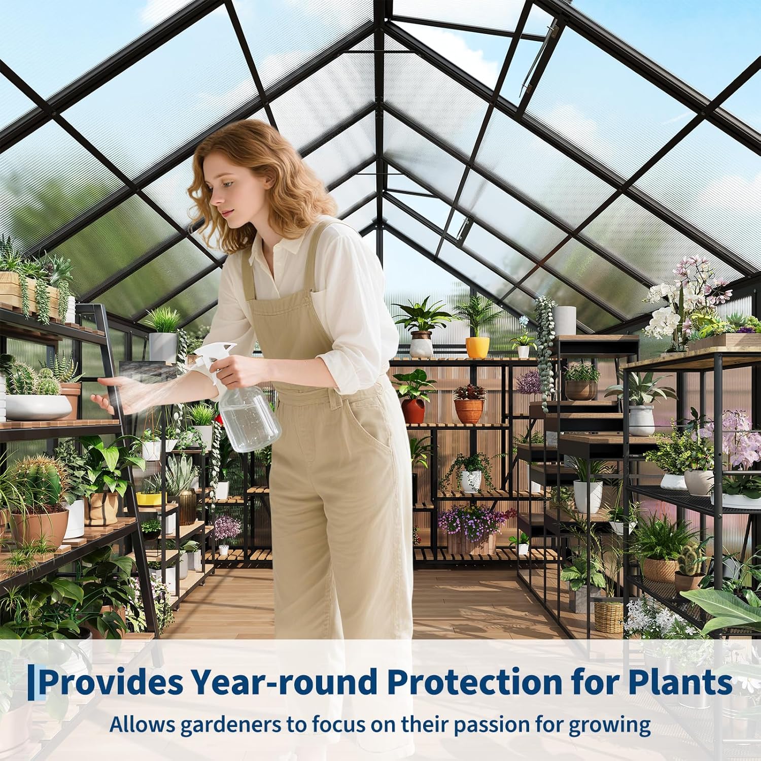 • 【Professional-Grade Protective Panels】​This greenhouse uses 720g/m² polycarbonate protective panels, which an ideal balance between durability and adaptability for plant growth. These panels effectively filter 70% of natural light while blocking 99.9% of harmful UV . They provide careful care for young seedlings and reliable protection for mature plants. Whether placed on a terrace, courtyard, or balcony, it maintains optimal growing conditions for a variety of plants.