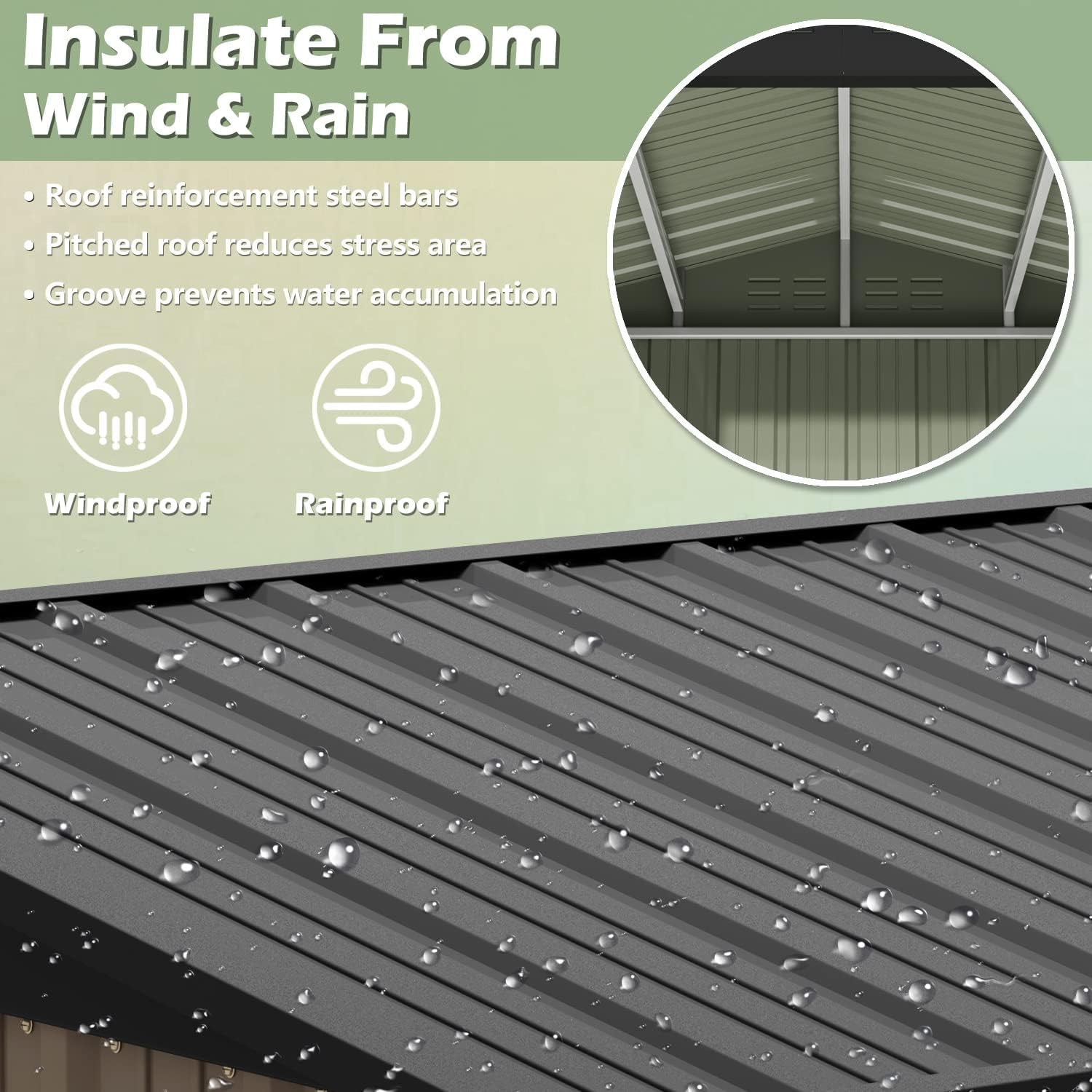 • [Security and Durability] 3 beams roofs stay strong in wind and snow. The metal garden storage shed adopts electro-galvanized steel process and paint treatment, which is suitable for various climates, without worrying about the metal rusting, the all-metal storage shed will not be deformed by the sun, and has excellent moisture-proof performance.