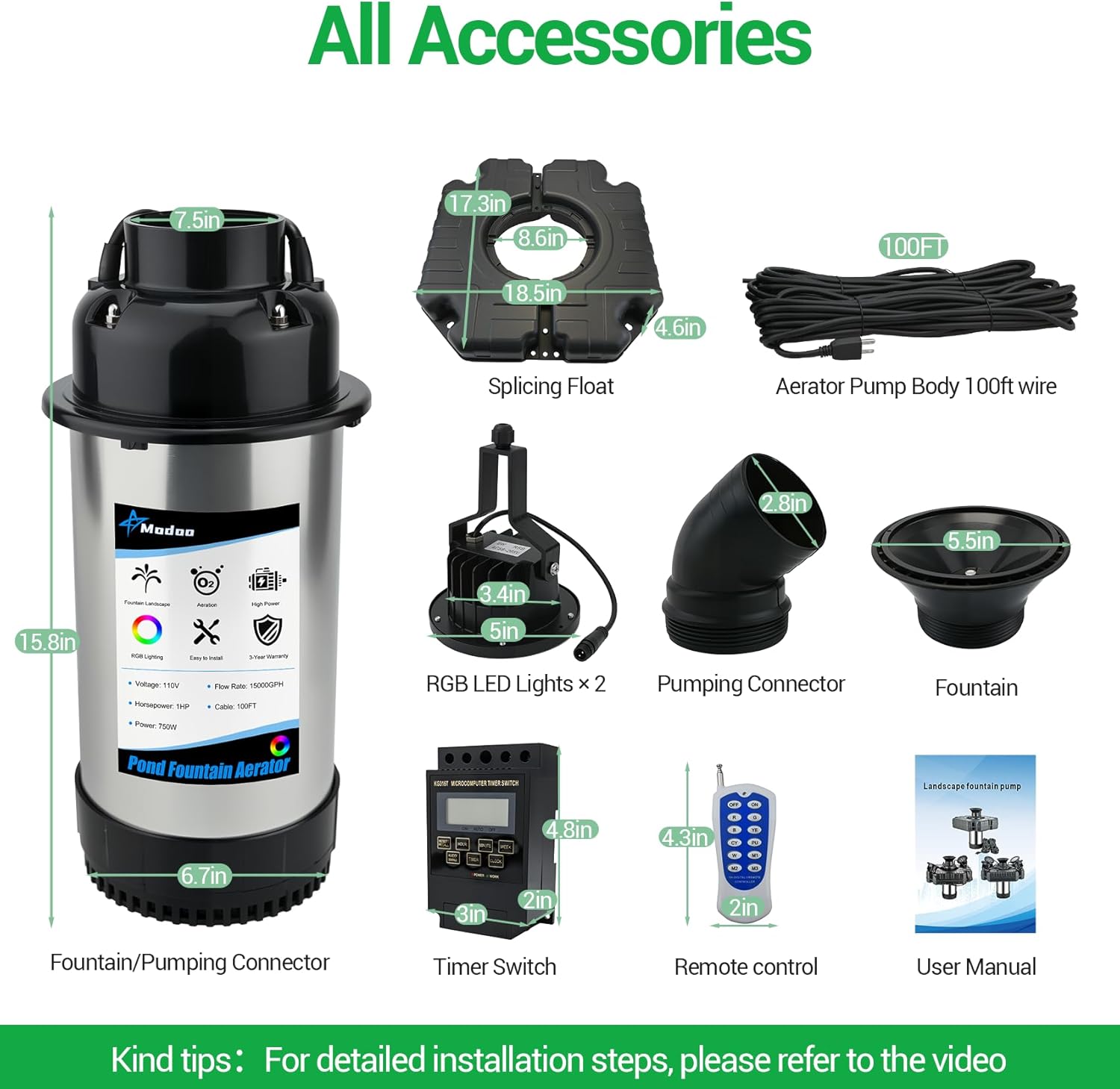 • [RGB LED Pond Fountain Aerator]: Upgraded pond fountain aerator with 2 RGB LED lights and can turn your pond or lake into a beautiful and spectacular fountain landscape. Fountain coverage up to 28ft, height 10ft, effectively providing continuous aeration for your pond. And the RGB light fountain aerator make your pond or lake still colorful in the quiet night. It supports remote control, allowing you to easily switch between colors and dynamic color modes to create a personalized waterscape.