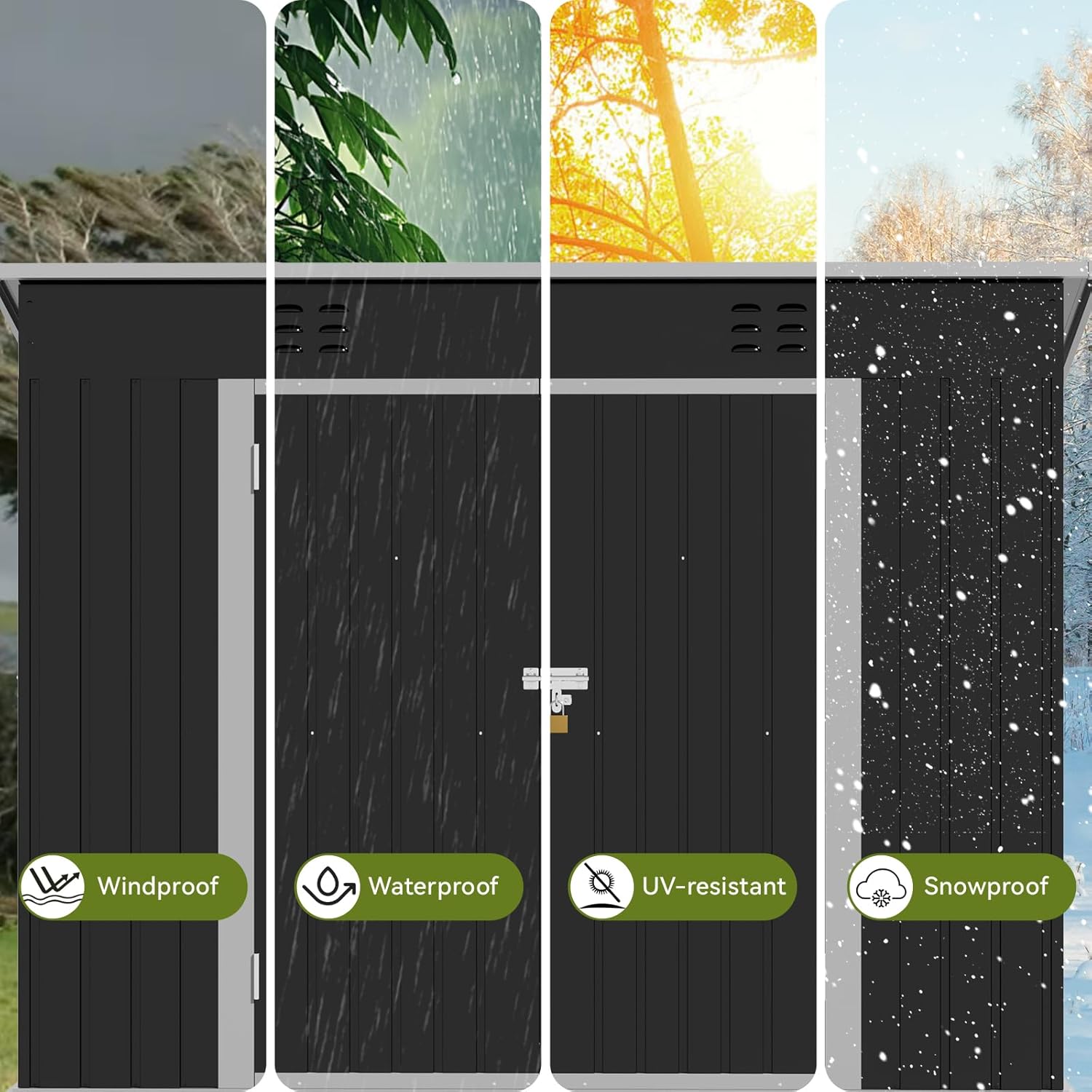 • Waterproof Tool Shed:The sloping roof design of this storage outdoor shed maximizes space utilization;effectively direct rainwater away from the structure to prevents the leakage,Don't worry about your items getting wet