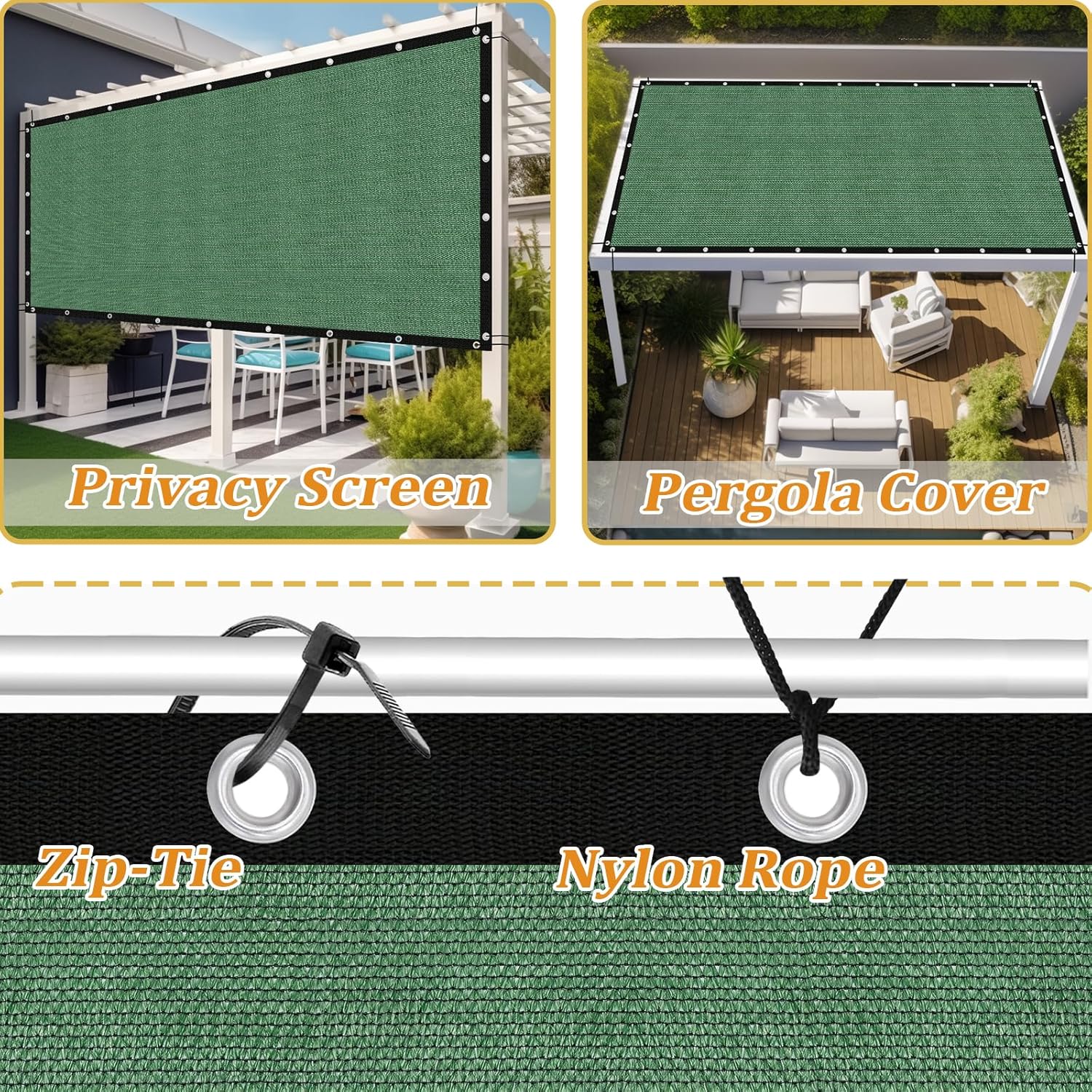 • NOTE: Custom size mounting accessories only include nylon rope and zip ties , no elastic hooks or elastic balls are included [Customized ] This sunshade with grommets is made of high quality HDPE 200GSM, which can provide 116% UV blocking, effectively cooling down and maintain air circulation. Suitable for many spaces, not only your garden, patio, you can use it as a sunshade or make it a privacy fence