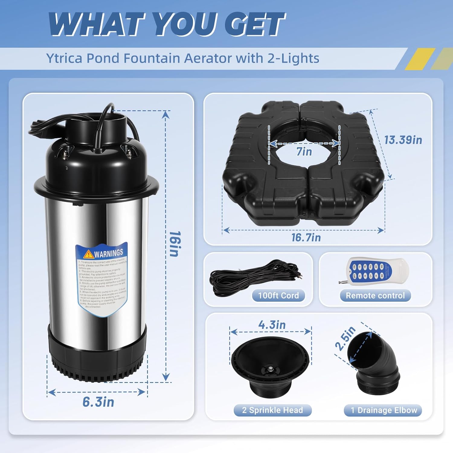 • 【VIBRANT LIGHT SHOW: 2-LIGHTS & REMOTE】Each floating fountain aerator features two powerful 9W LED lights, equipped with seven multi-color light beads, designed to illuminate your pond or lake with stunning visual depth. With the included remote, you can effortlessly control the fountain pump—easily switching between colors and lighting modes.