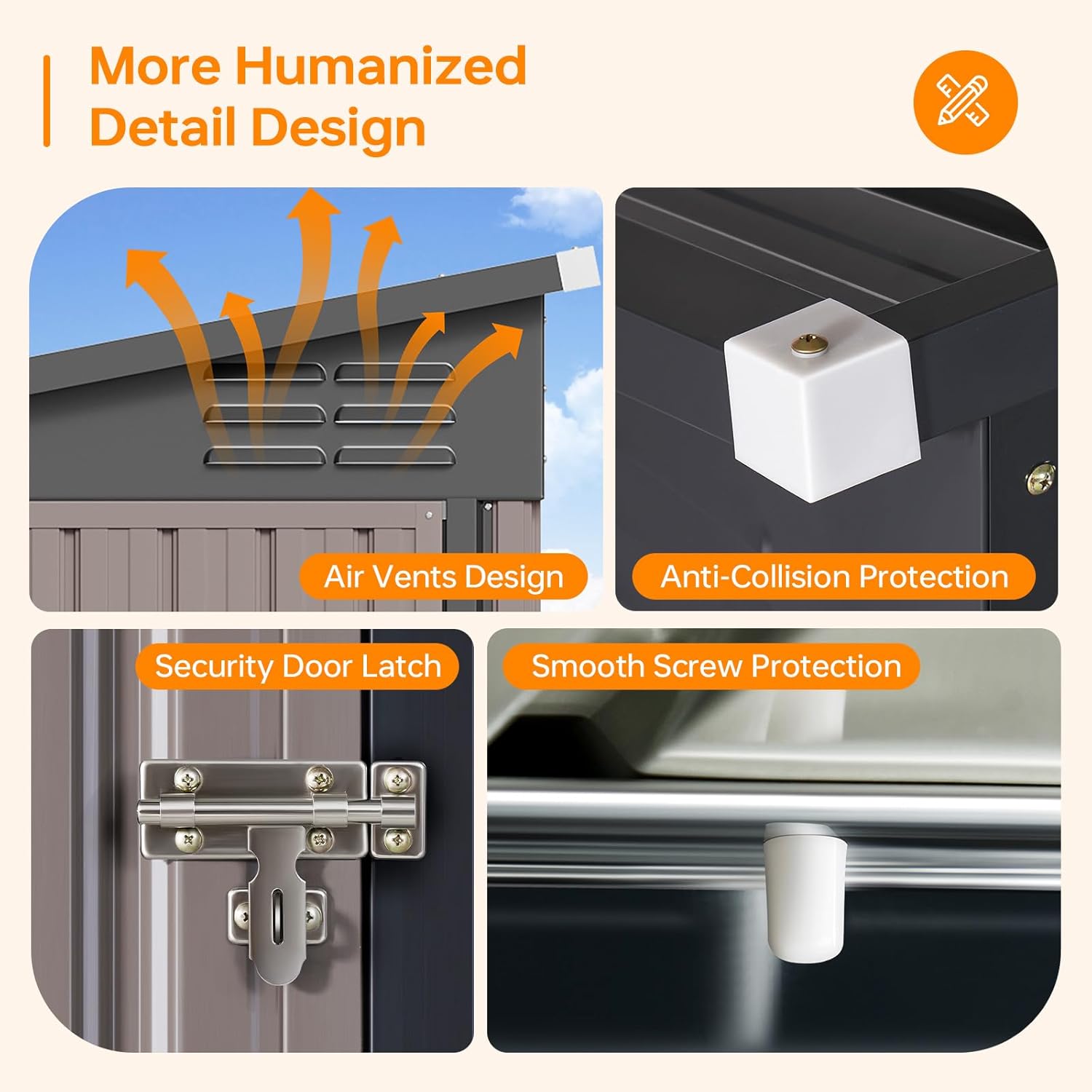 • Robust & Weatherproof Build: This outdoor storage shed is constructed from galvanized steel with waterproof engineering. It delivers enduring resilience against severe weather. Its reinforced metal roof and walls prevent deformation, while the sturdy frame withstands winds up to 30mph (Level 6) and snow loads of 6 inches.