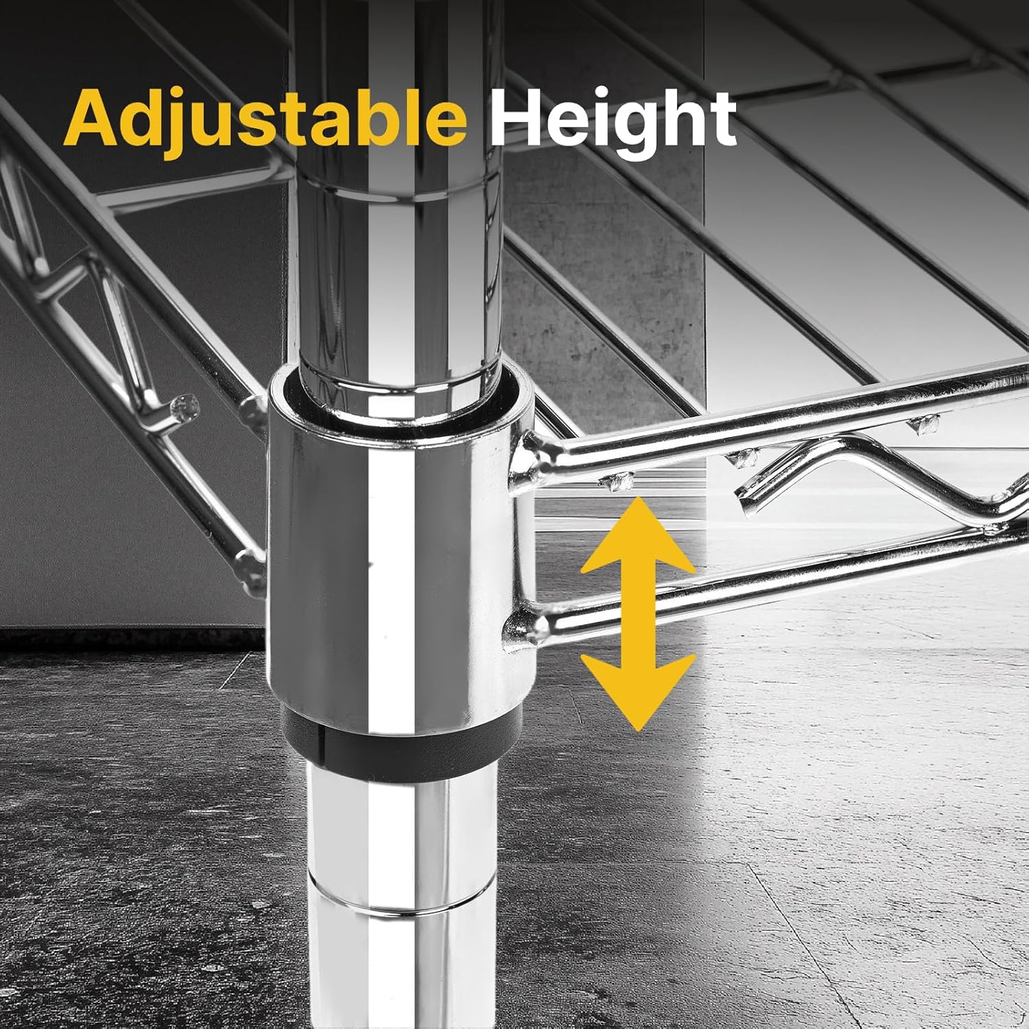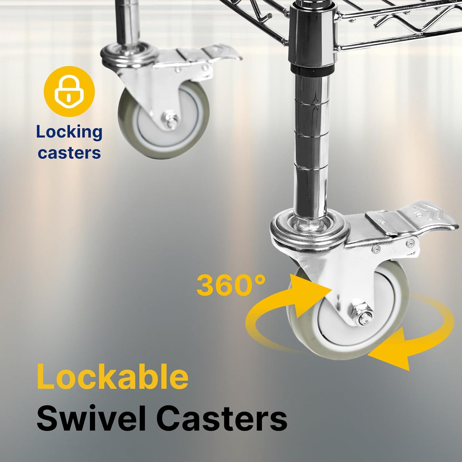 • Heavy-Duty & Spacious Utility Cart Durable chrome-finish wire frame resists corrosion and adds sleek, professional styling. With 24” × 18” shelves and 44.1” height, this rolling utility cart on wheels is ideal for use as a kitchen cart, bar cart, or office rolling cart, offering generous space for everyday storage.