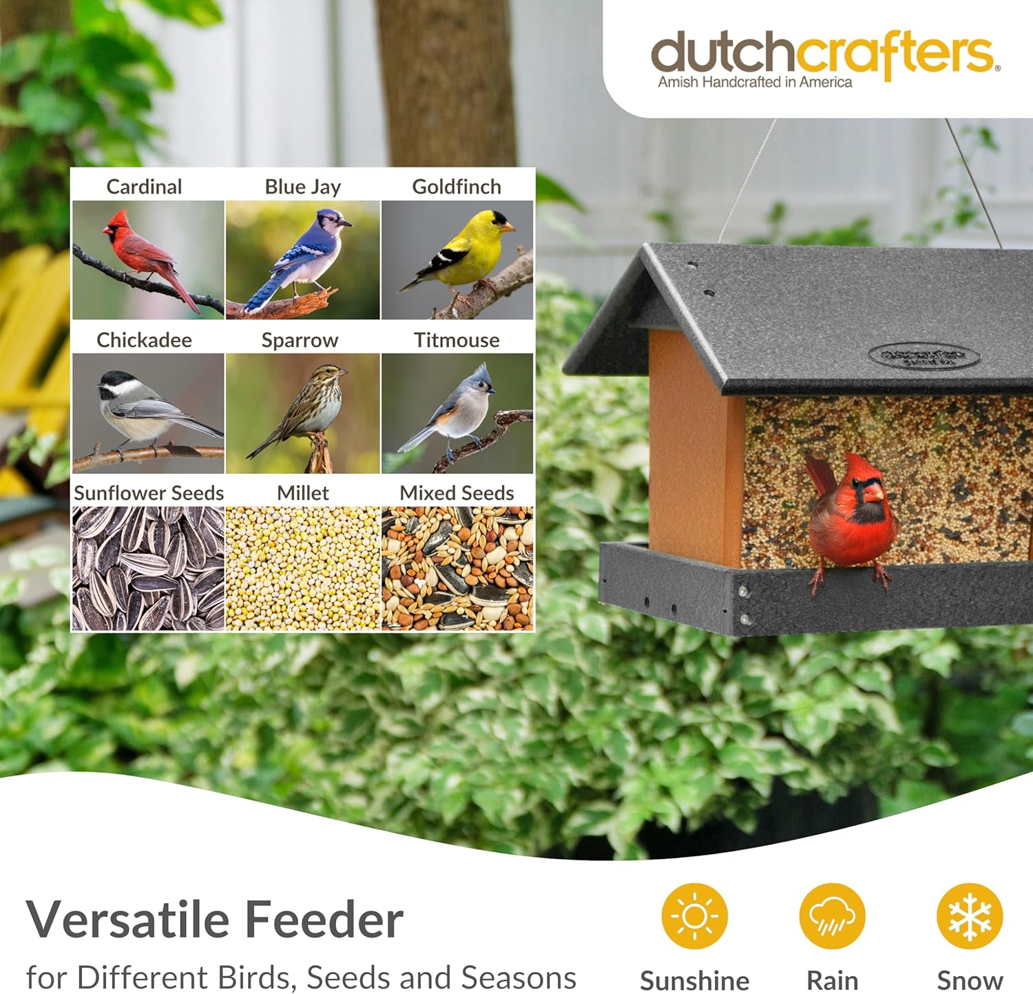 • Heavy Duty Bird Feeder - Our hopper feeders for wild birds are crafted from HDPE recycled plastic poly lumber that is water resistant, making the covered bird feeder hopper durable and long lasting. Our recycled plastic bird feeder has an aluminum mesh tray for drainage, stainless steel hanging wire and hardware to prevent rust