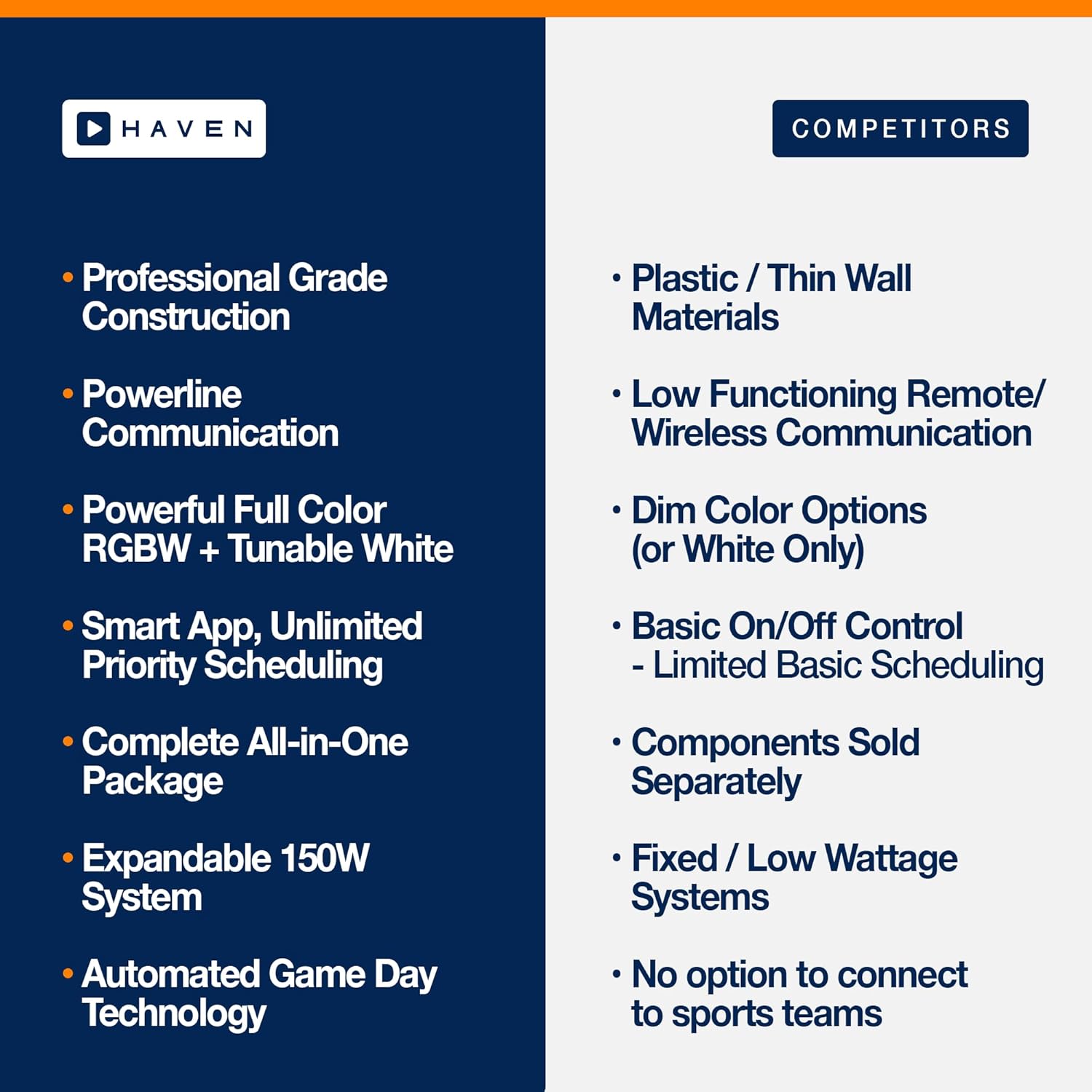 • Game Day & Holiday Ready - Only Haven offers real-time Game Day Technology, syncing your lights to touchdowns or wins. Year-round Scenes automatically update for holidays, even floating dates, making it the most customizable outdoor lighting system available.