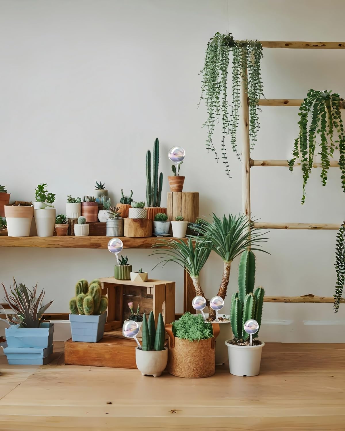 • 【Premium Hand-Blown Glass】Each watering globe is crafted from high-quality glass using traditional hand-blown techniques. The iridescent laser-etched surface creates beautiful rainbow light gradients in sunlight, making these functional plant waterers equally stunning as decorative pieces