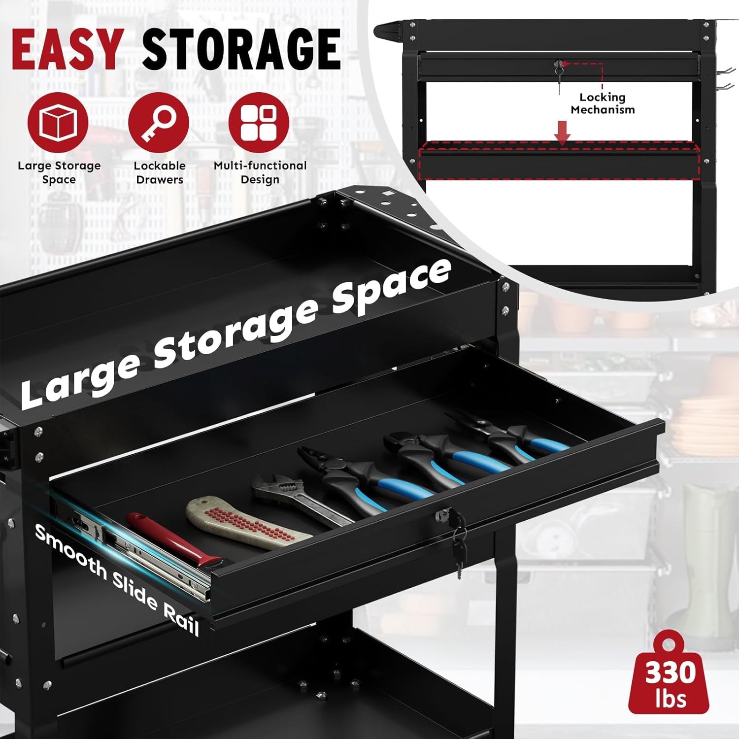• Efficient Tool Organization: This rolling tool cart offers ample storage space with 3 trays,a lockable drawer, a tool panel. It’s hooks and plugs for small parts, allowing easy access to frequently used tools and enhancing your workflow efficiency.