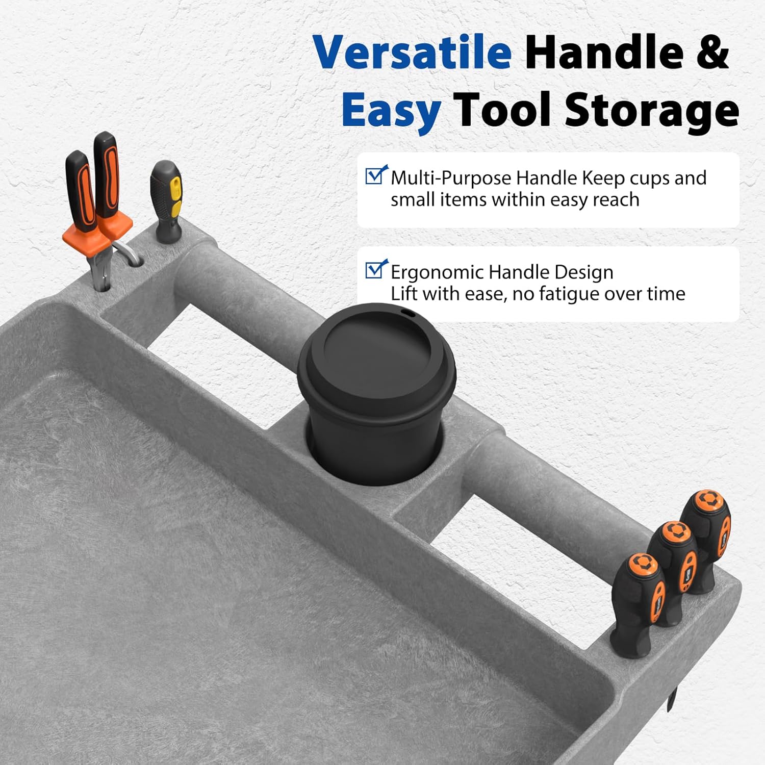 • 【Ergonomic Multifunctional Handle】 Dual handles designed for comfort and reduced fatigue, with a central storage space for cups, tools, or small parts. Perfect for keeping essentials within reach when using this work cart on wheels or rolling tool cart.