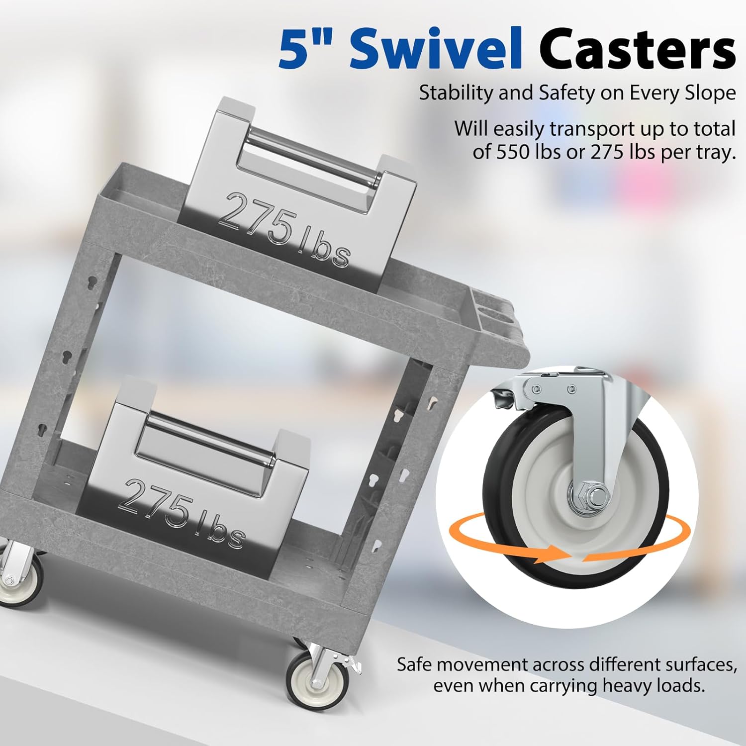• 【Heavy-Duty Load Capacity】 Constructed from high-quality polypropylene (PP), this rolling utility cart is lightweight yet durable, resistant to scratches, rust, and dents, supporting up to 550 lbs (275 lbs per shelf). Perfect for use as a tool cart on wheels, work cart, or plastic utility cart for heavy-duty tasks.