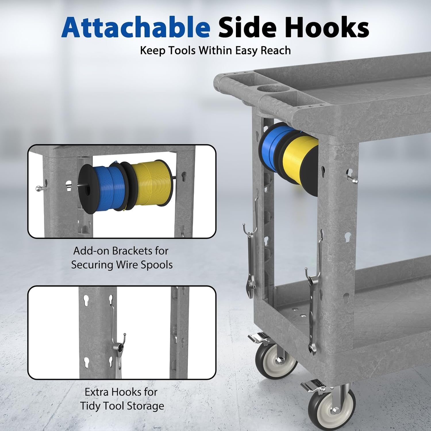 • 【Versatile Side Hole Design】 Multiple side holes allow installation of hooks or accessories to expand storage and organization capabilities. Use as a tool cart, plastic cart with wheels, or multi-purpose utility cart to hold tools, parts, or supplies.