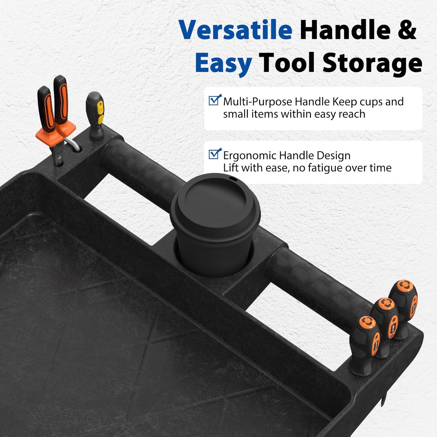• 【Ergonomic Multifunctional Handle】 Dual handles designed for comfort and reduced fatigue, with a central storage space for cups, tools, or small parts. Perfect for keeping essentials within reach when using this work cart on wheels or rolling tool cart.