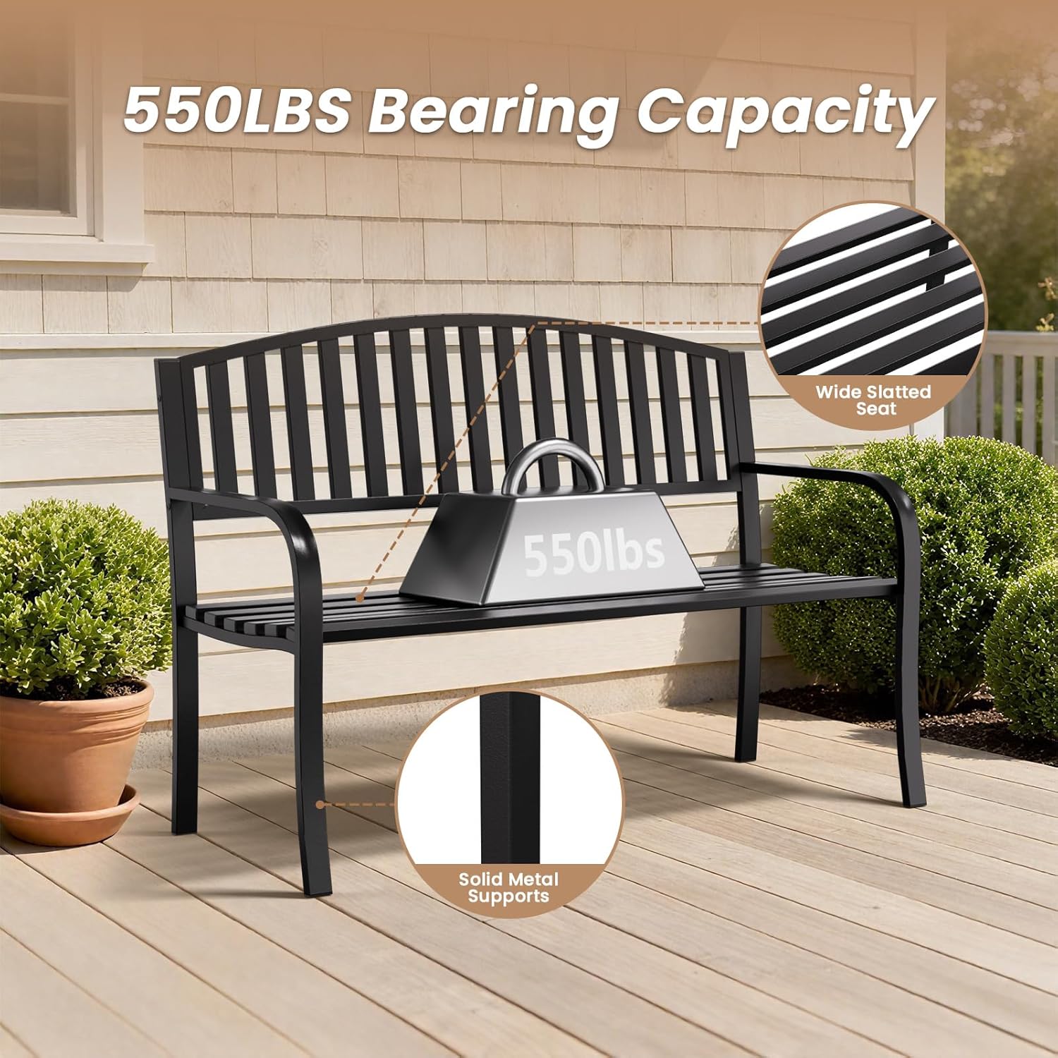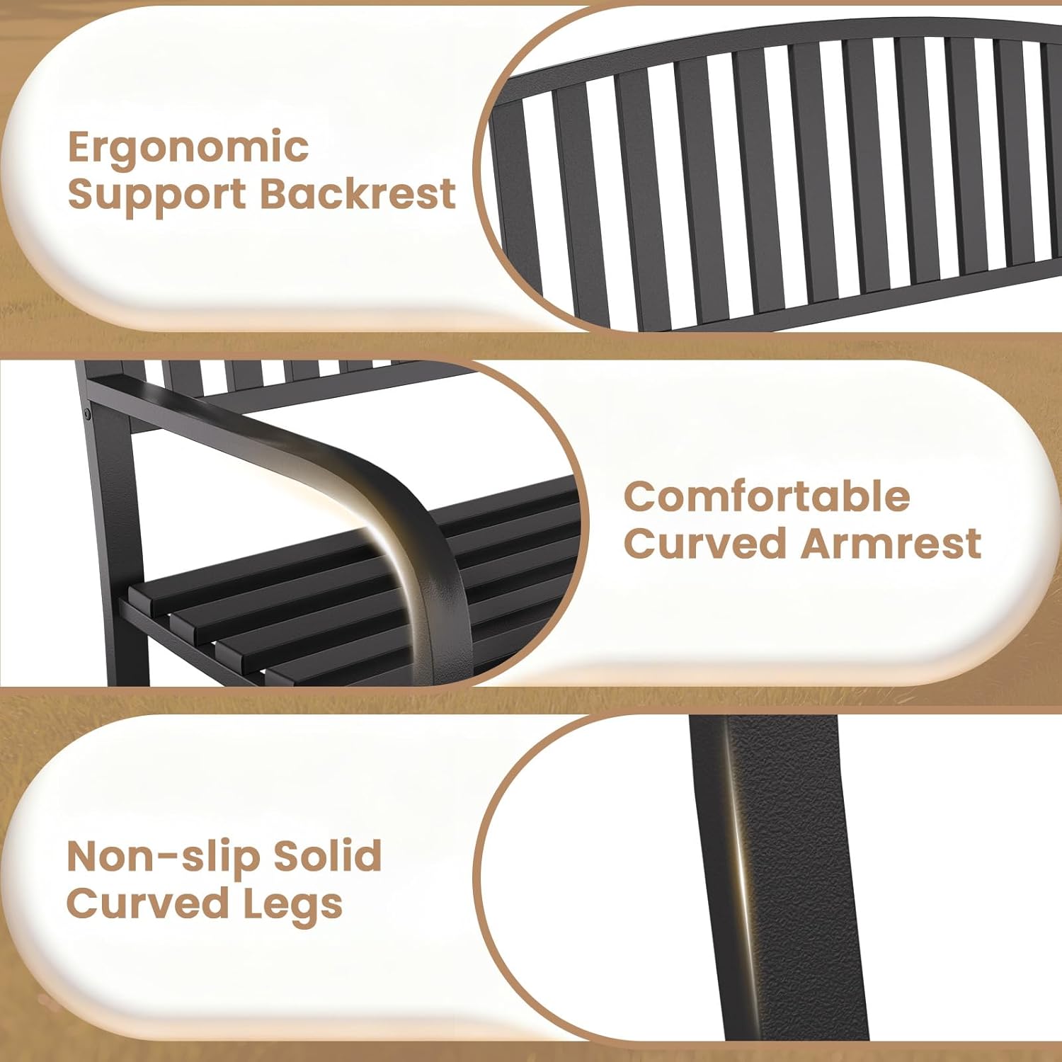 • 【Excellent Metal bench】Unlike fragile wood, this outdoor bench is made of reinforced iron which has excellent sturdiness and stability allow it to support 550lbs and use for years.The garden benches for outdoors applying to lots of areas, such as garden, park, patio, front porch, entryway.