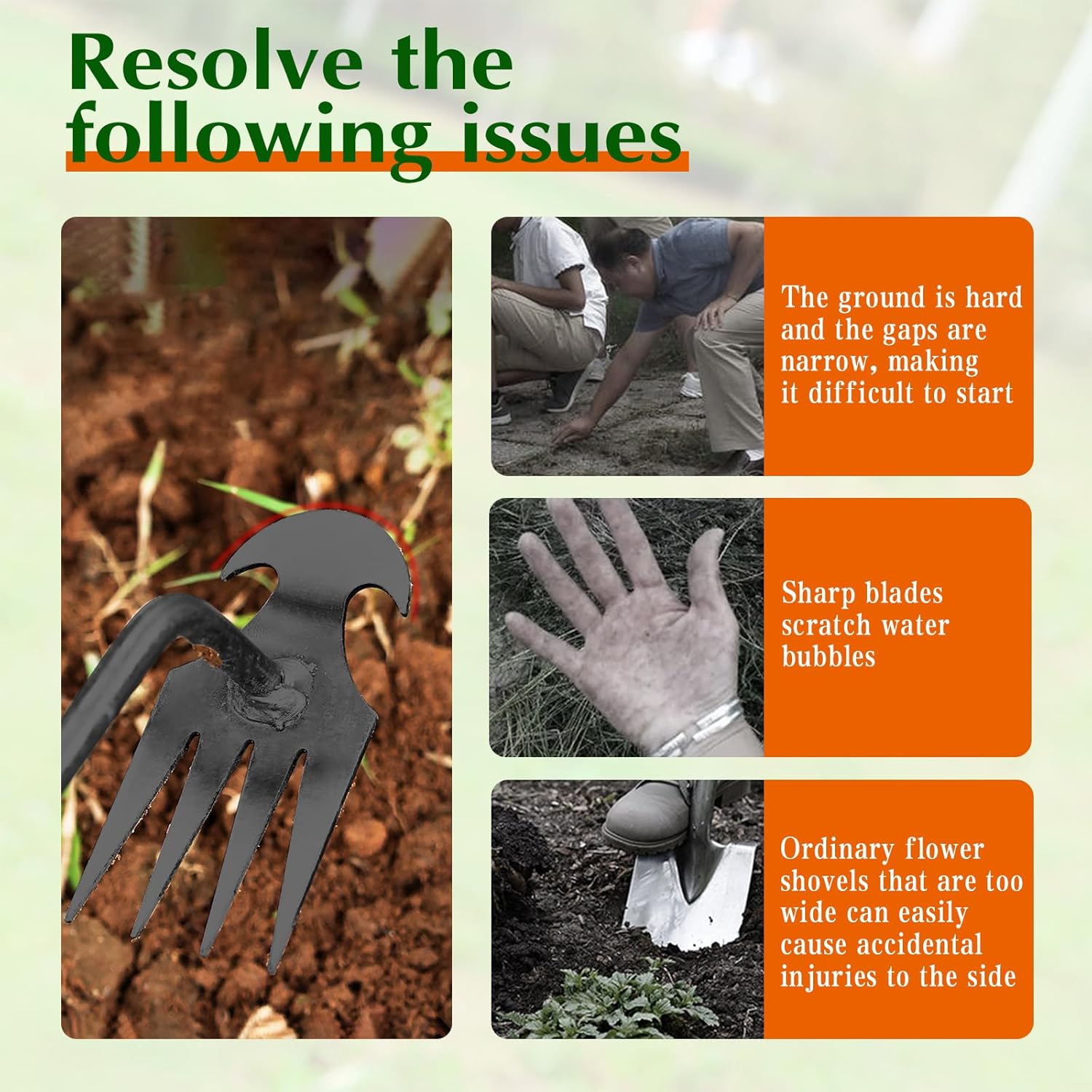 • 【Durable Material】The four-tooth uprooting weeding tool is made of high-quality anti-rust manganese steel, with high hardness and durability. The 8 mm steel bars has high impact resistance and tensile strength, not easy to deform or break. The polished surface is non-stick.