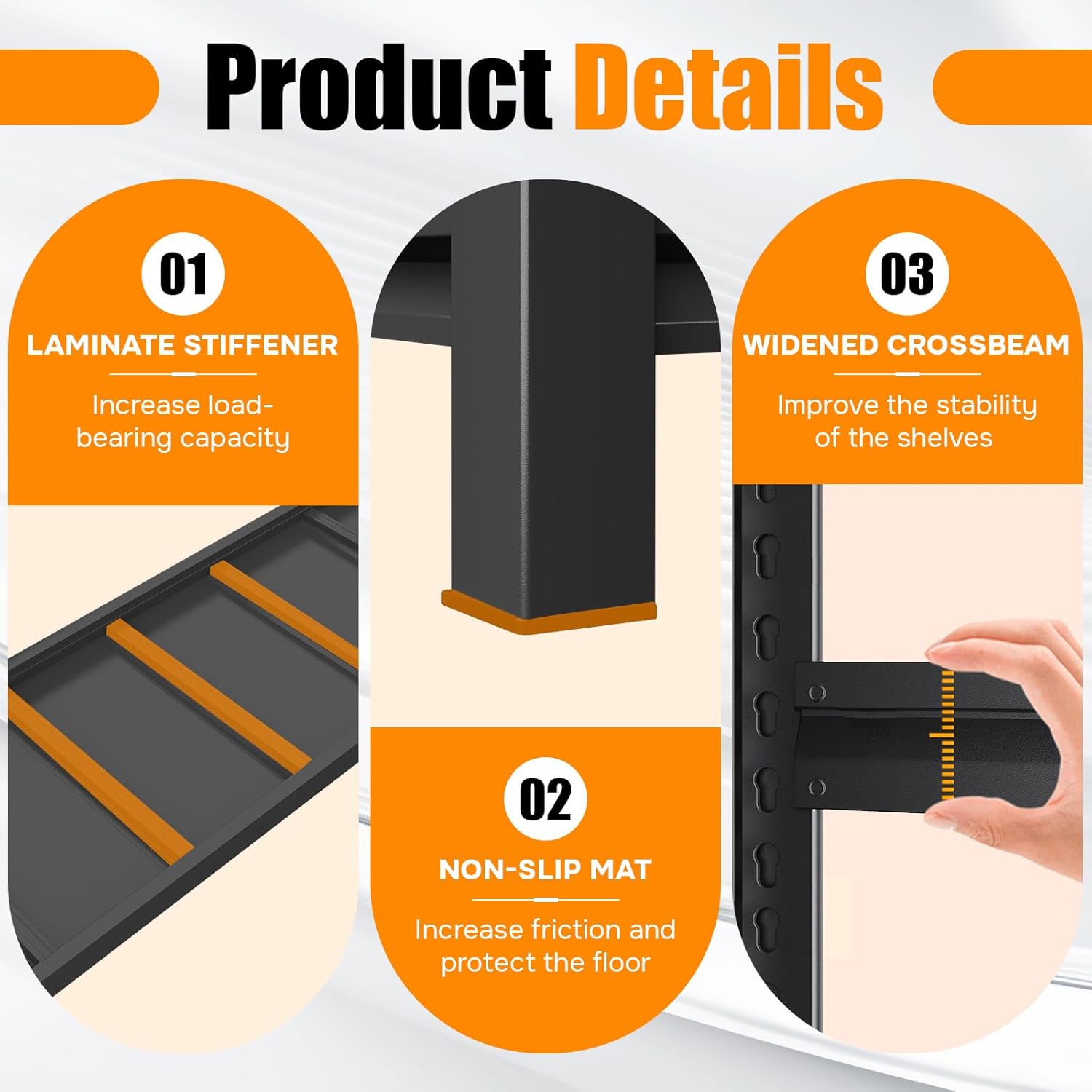 • Upgraded Double-Layer Columns and Reinforced Beams: Unlike ordinary garage shelves on the market that use single-layer columns, our product features upgraded double-layer columns. Double-layered columns and reinforced beams ensure these garage shelves are exceptionally stable. Thanks to a scientifically engineered frame structure, weight is distributed effectively—eliminating concerns about shelving shifting or boards warping