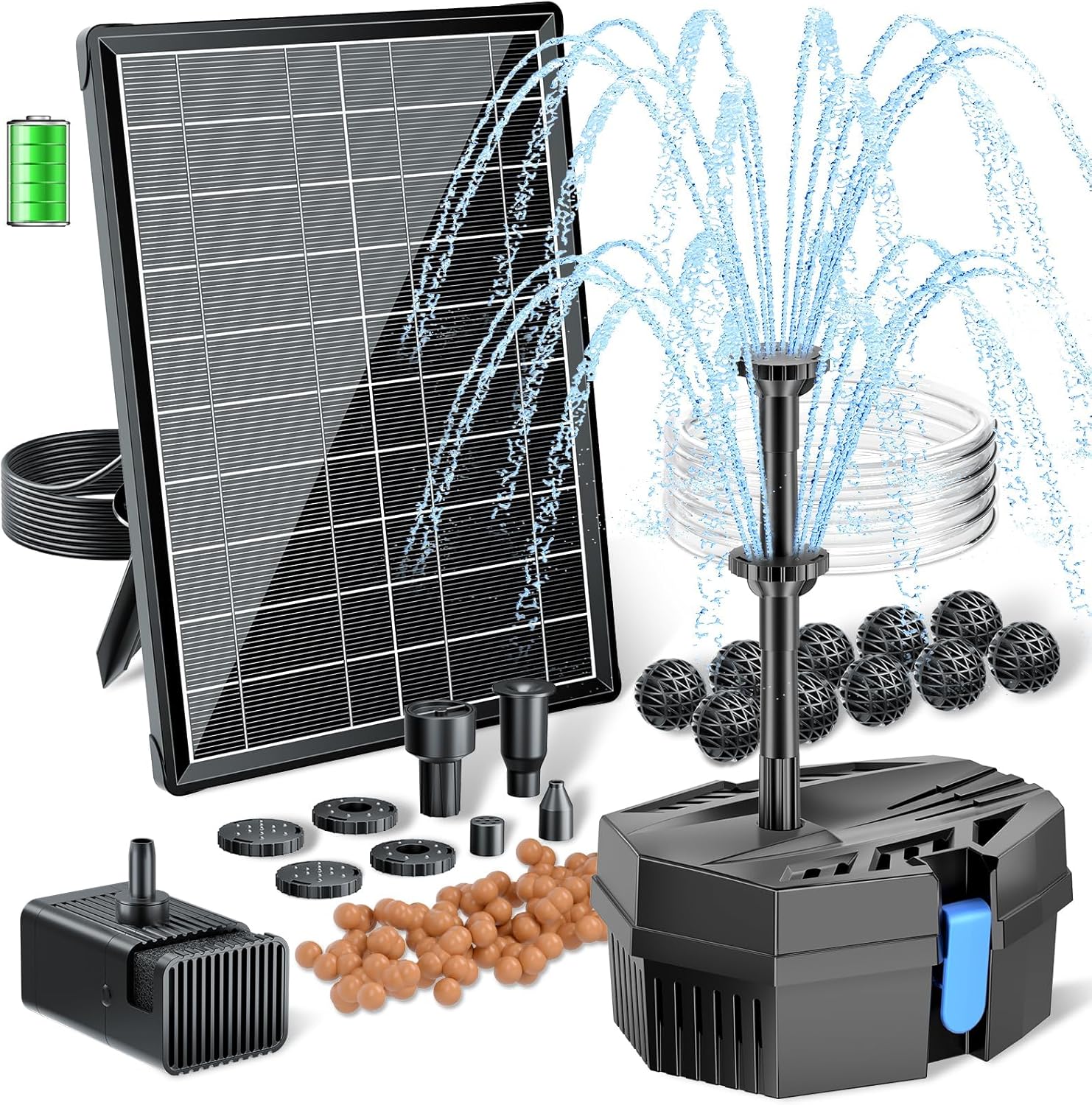 • 【Solar Powered with Battery Backup】This solar fountain pump boasts a powerful 8W solar panel AND built-in 3000mAh battery backup, ensuring continuous operation even on cloudy days. Say Goodbye to Intermittent Fountains! (Note: This solar fountain does not operate at night.)