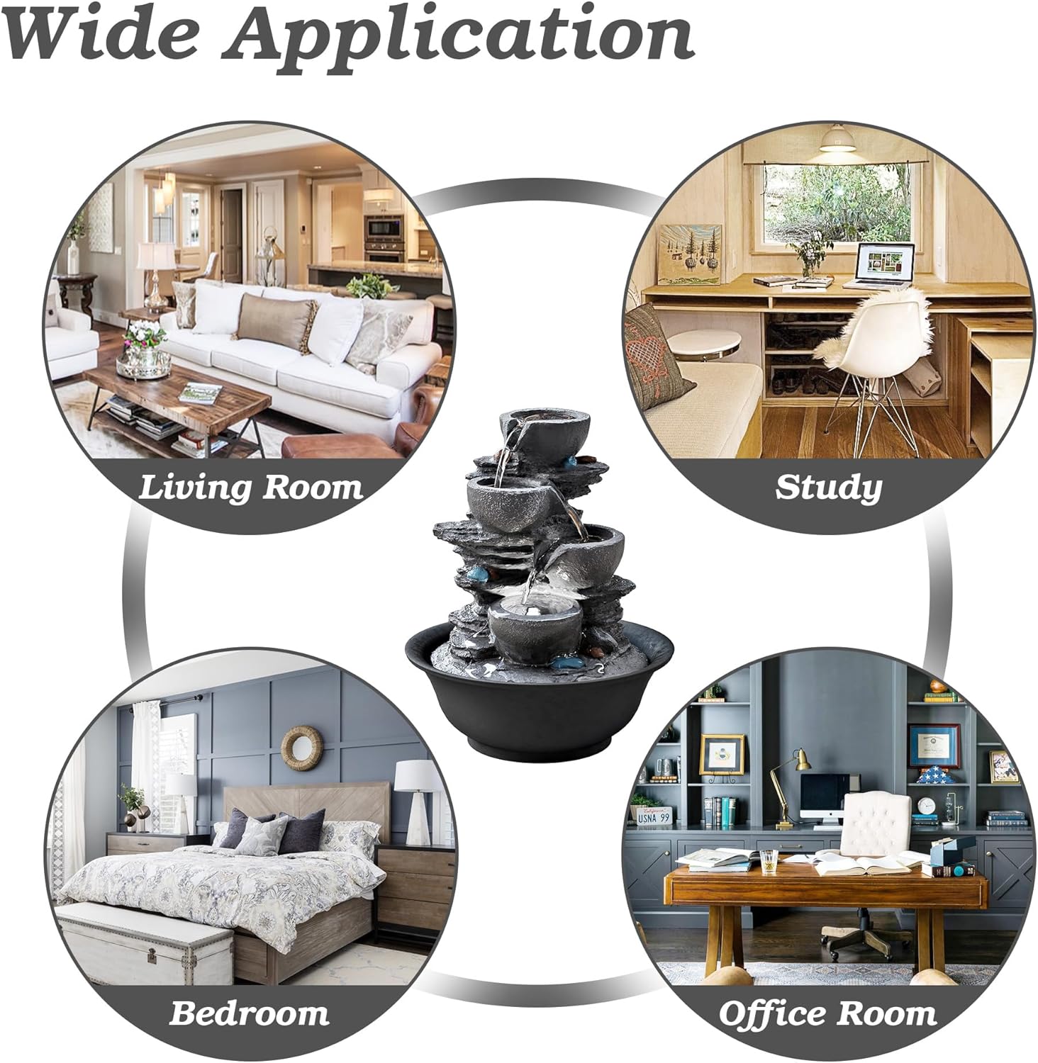 • Wide Application:Suitable for various scenarios, this fountain can be placed in the living room to enhance the home ambiance, in the study to create a peaceful atmosphere for reading and working, in the bedroom for a relaxing environment, or in the office to add a touch of nature and reduce stress.
