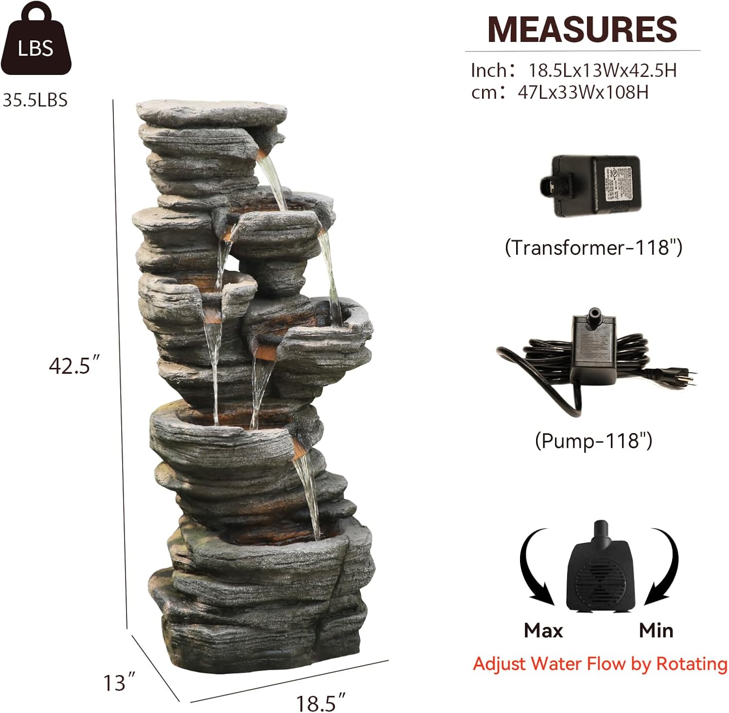 42.5" H Garden Outdoor Water Fountain with LED Lights & Pump, Mutiply-Tier Cascading Outdoor Fountain Suitable for Garden/Patio/Yard/Deck/Balcony and Home Art Decor(Resin)